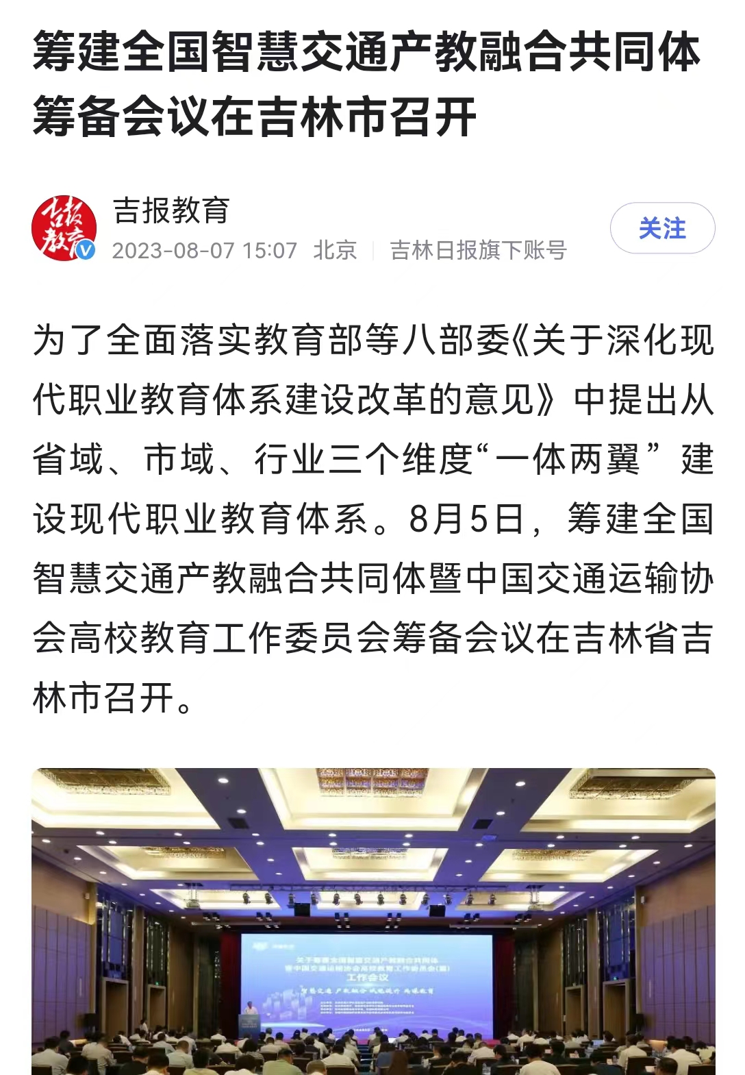 8月7日,【吉报教育】以“吉林铁道职业技术学院联合承办的筹建全国智慧交通产教融合共同体暨中国交通运输协会高校教育工作委员会筹备会议在吉林市召开”为题对我校进行了报道。