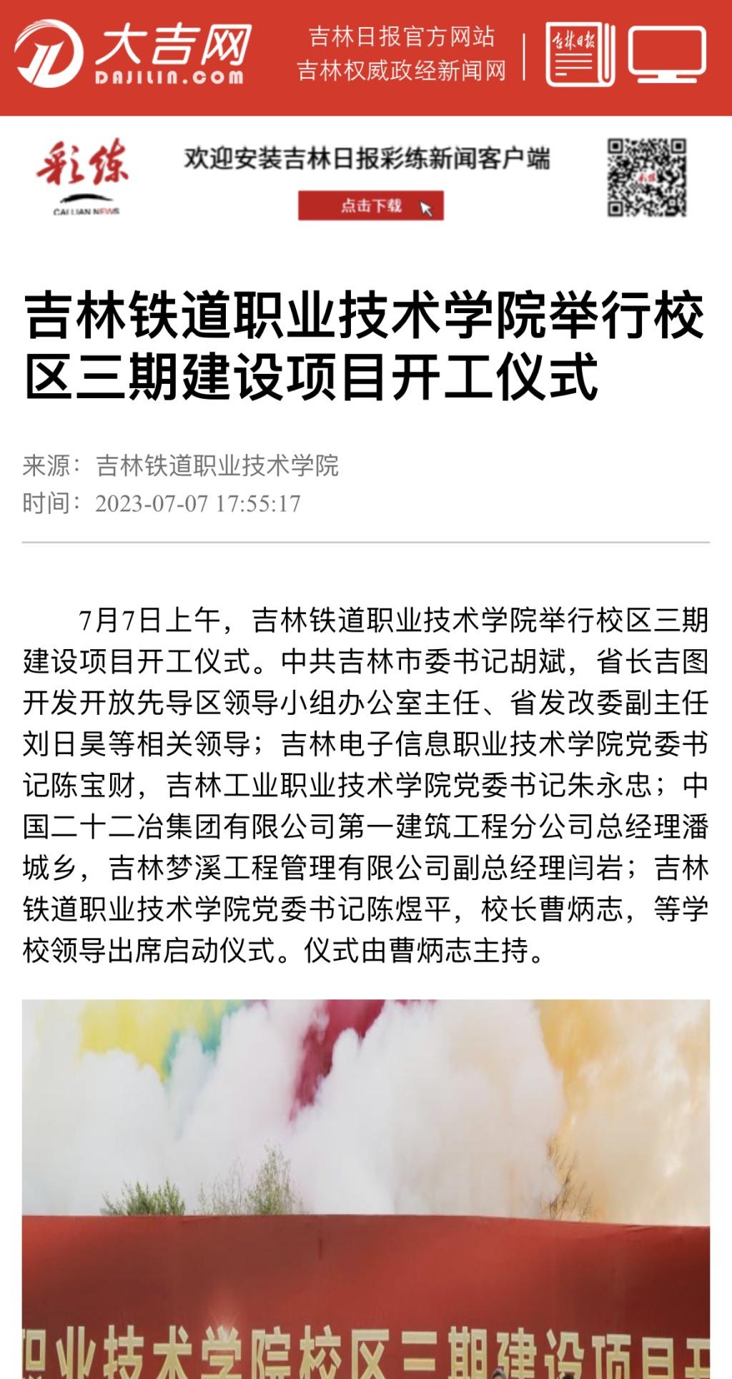 7月7日,【彩练新闻】以“吉林铁道职业技术学院举行校区三期建设项目开工仪式”为题对我校进行了报道。