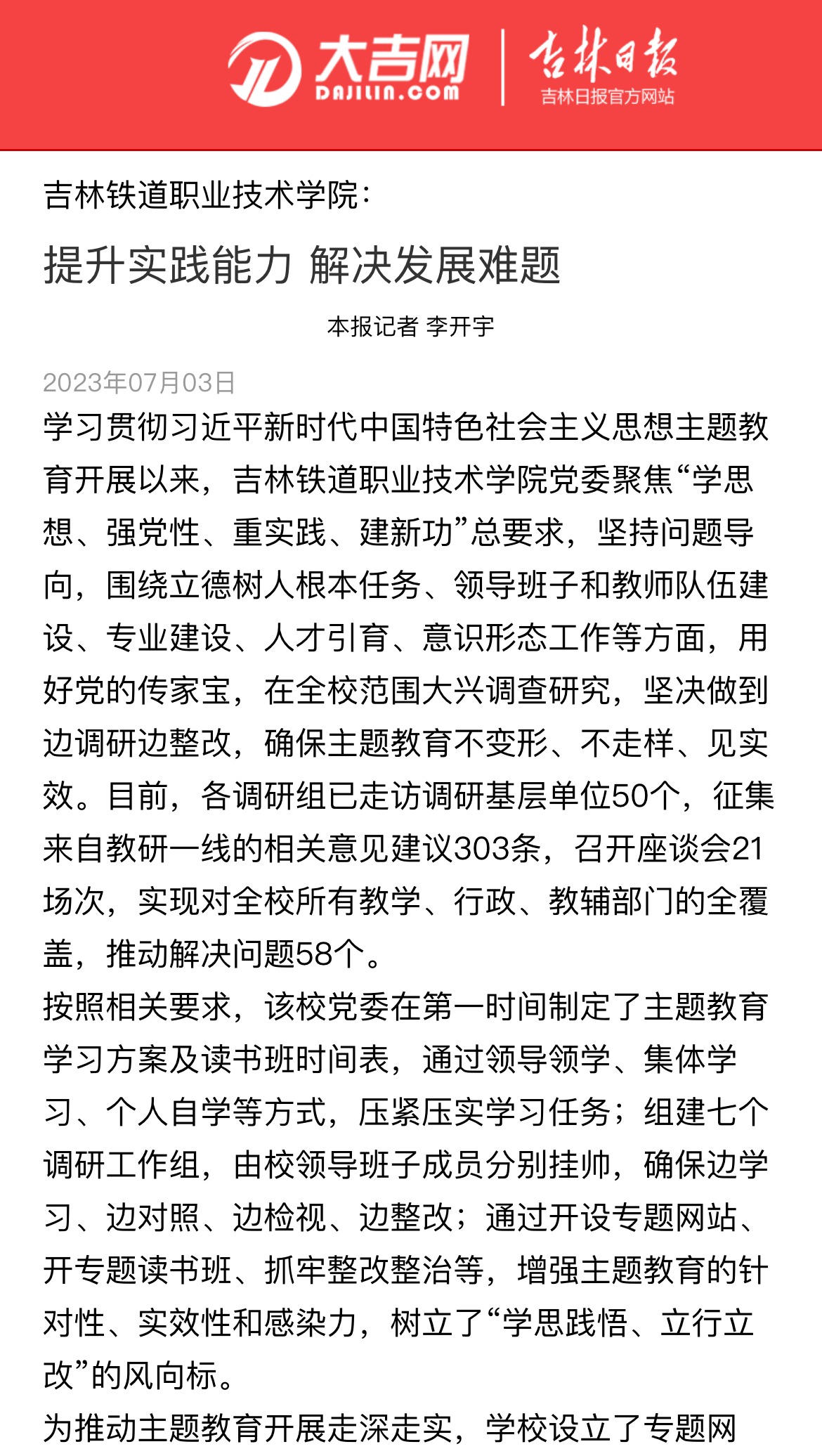 7月3日,【吉林日报】以“吉林铁道职业技术学院:提升实践能力 解决发展难题”为题对我校进行了报道。