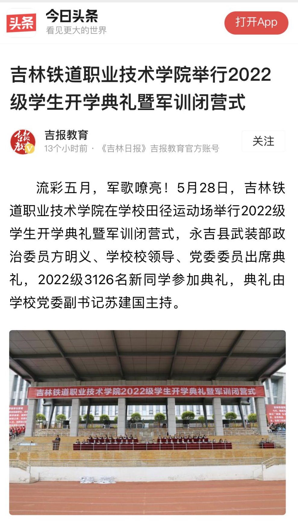 5月28日,【今日头条】以“吉林铁道职业技术学院举行2022级学生开学典礼暨军训闭营式”为题对我校进行了报道。