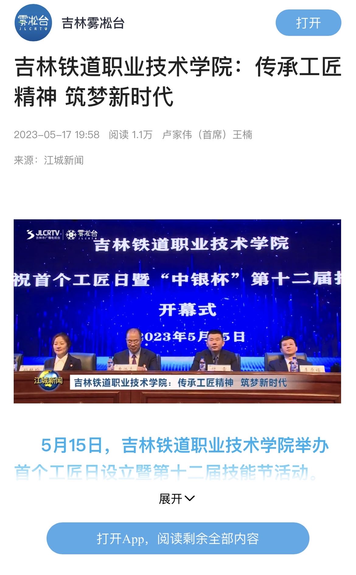 5月17日,【吉林雾凇台】以“吉林铁道职业技术学院:传承工匠精神 筑梦新时代”为题对我校举办首个工匠日设立暨第十二届技能节活动进行了报道。