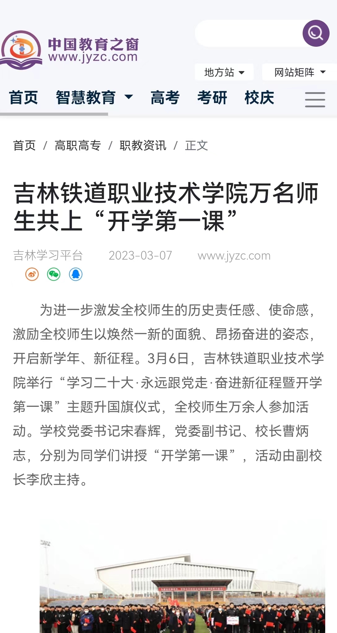 【中国教育之窗】吉林铁道职业技术学院万名师生共上“开学第一课”
