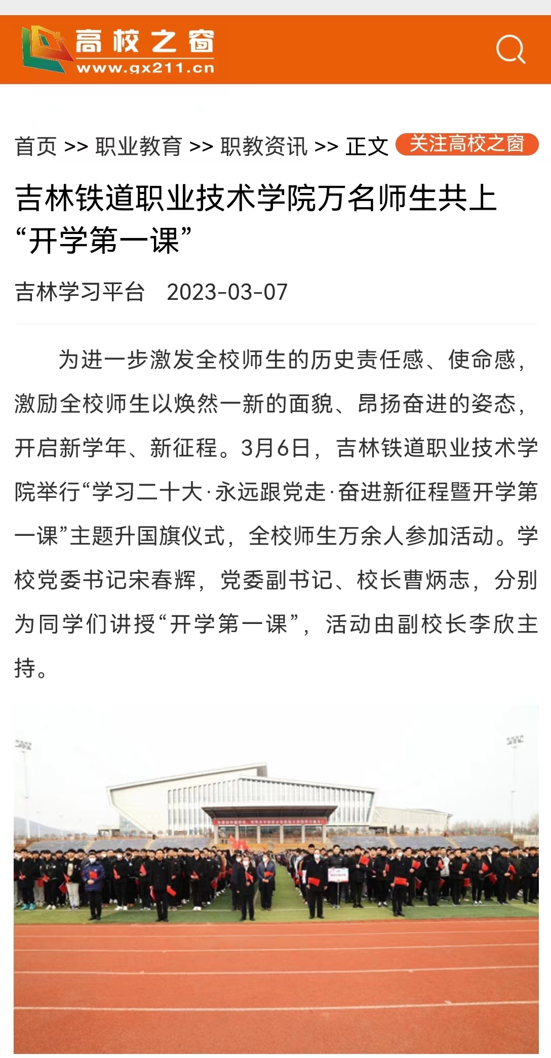 3月7日,【中国高校之窗】以“吉林铁道职业技术学院万名师生共上“开学第一课””为题对我校进行了报道。