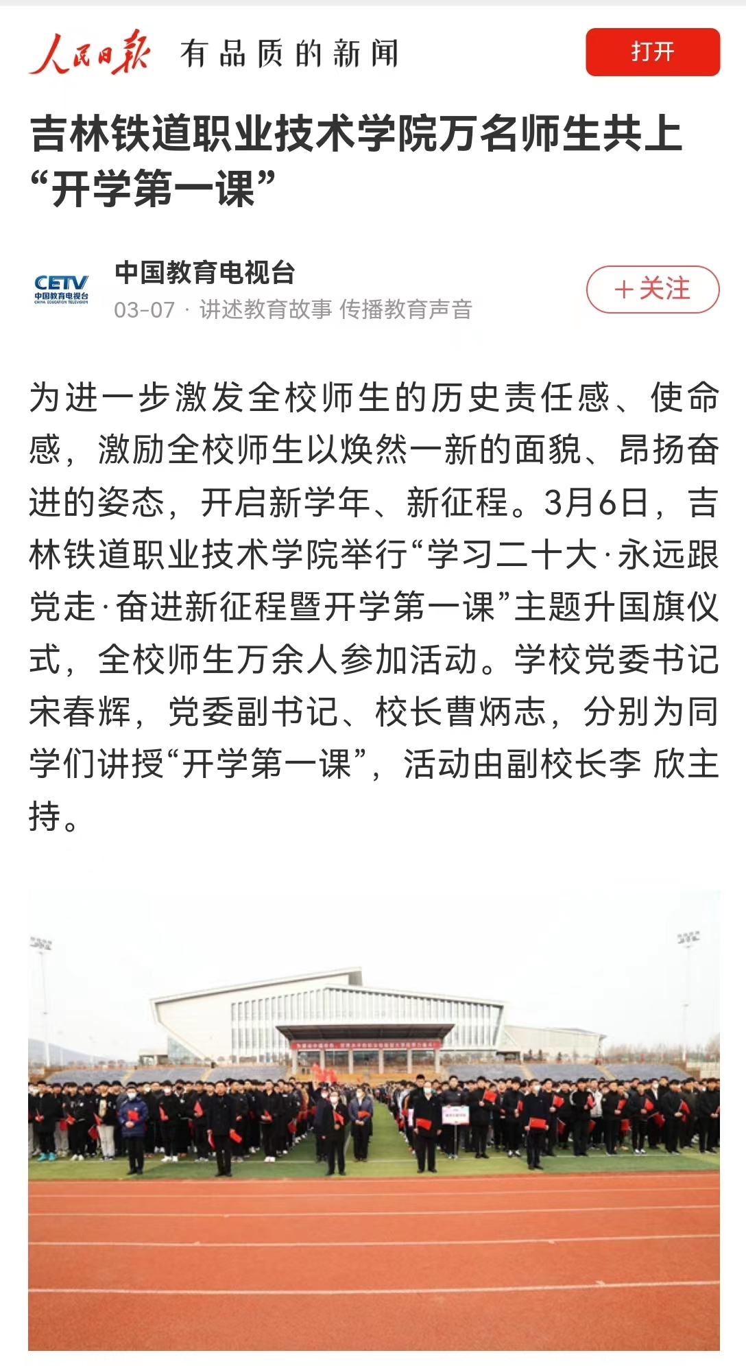3月7日,【人民日报】“中国教育电视台”以“吉林铁道职业技术学院万名师生共上“开学第一课””为题对我校进行了报道。