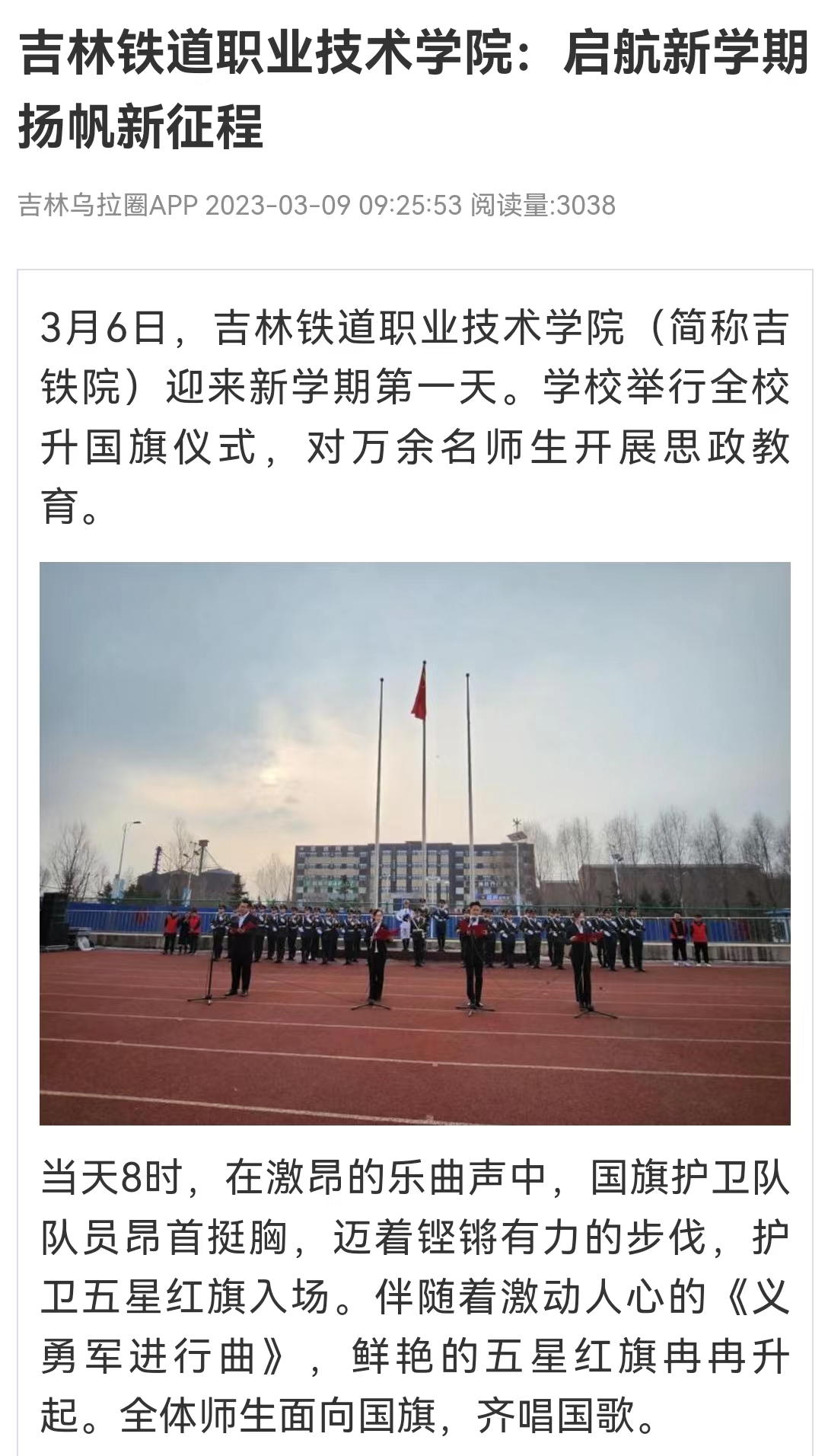 3月9日,【吉林乌拉圈】“吉林乌拉圈”以“吉林铁道职业技术学院:启航新学期 扬帆新征程”为题对我校进行了报道。