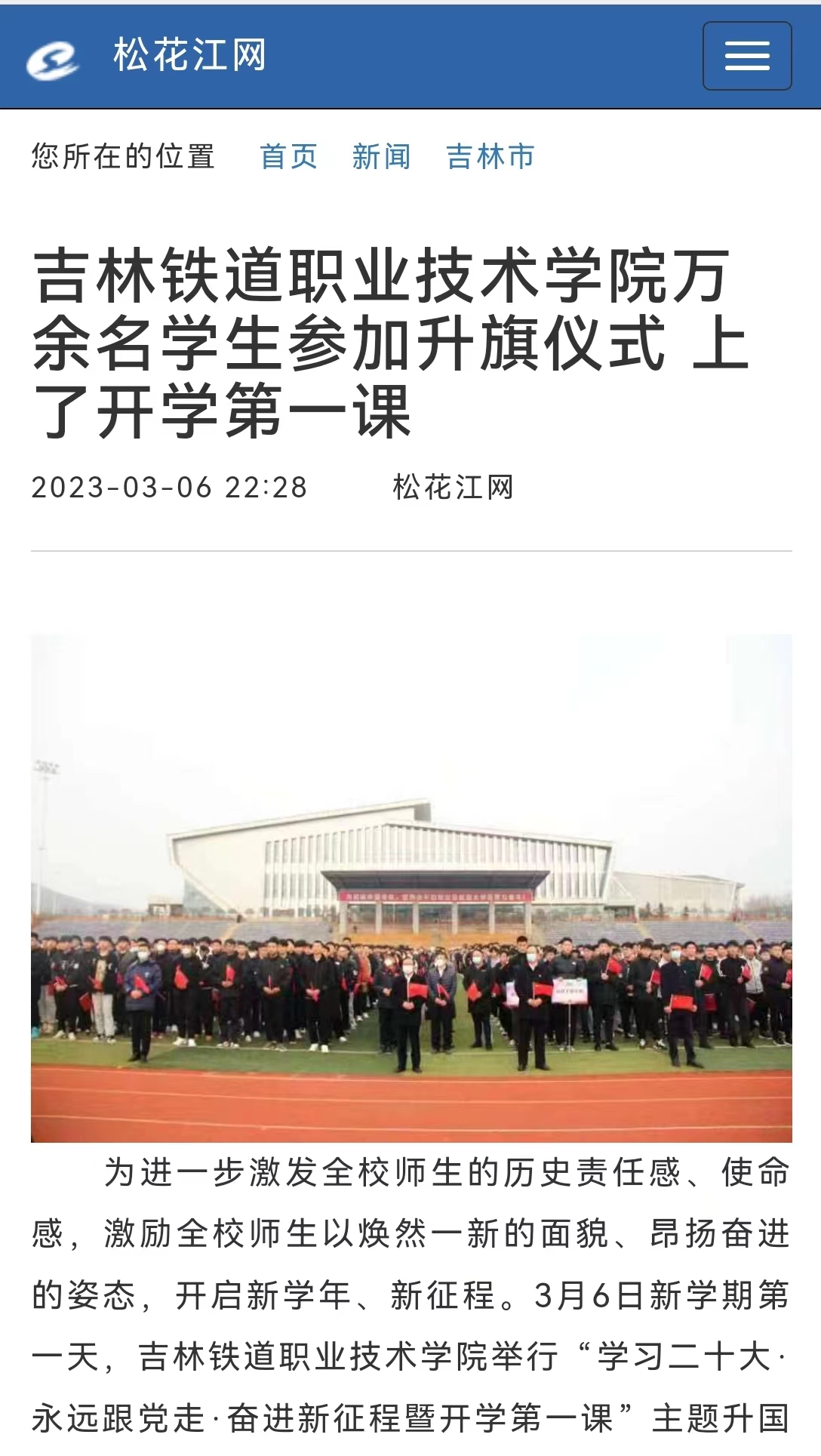 3月6日,【松花江网】“松花江网”以“吉林铁道职业技术学院万余名学生参加升旗仪式上了开学第一课”为题对我校进行了报道。