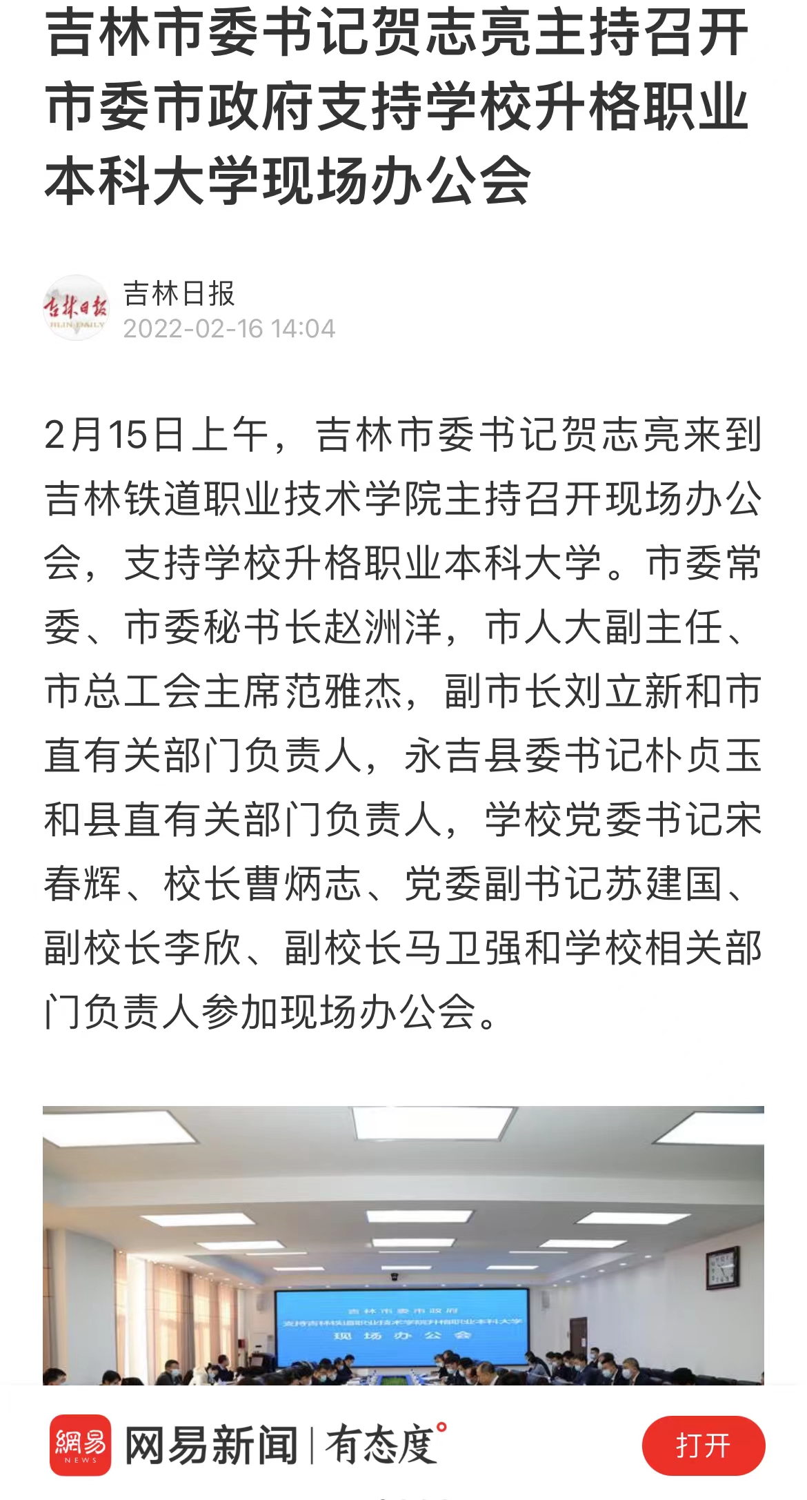 2月16日,【网易新闻】以“吉林市委书记贺志亮主持召开市委市政府支持学校升格职业本科大学现场办公会”为题对我校进行了报道。