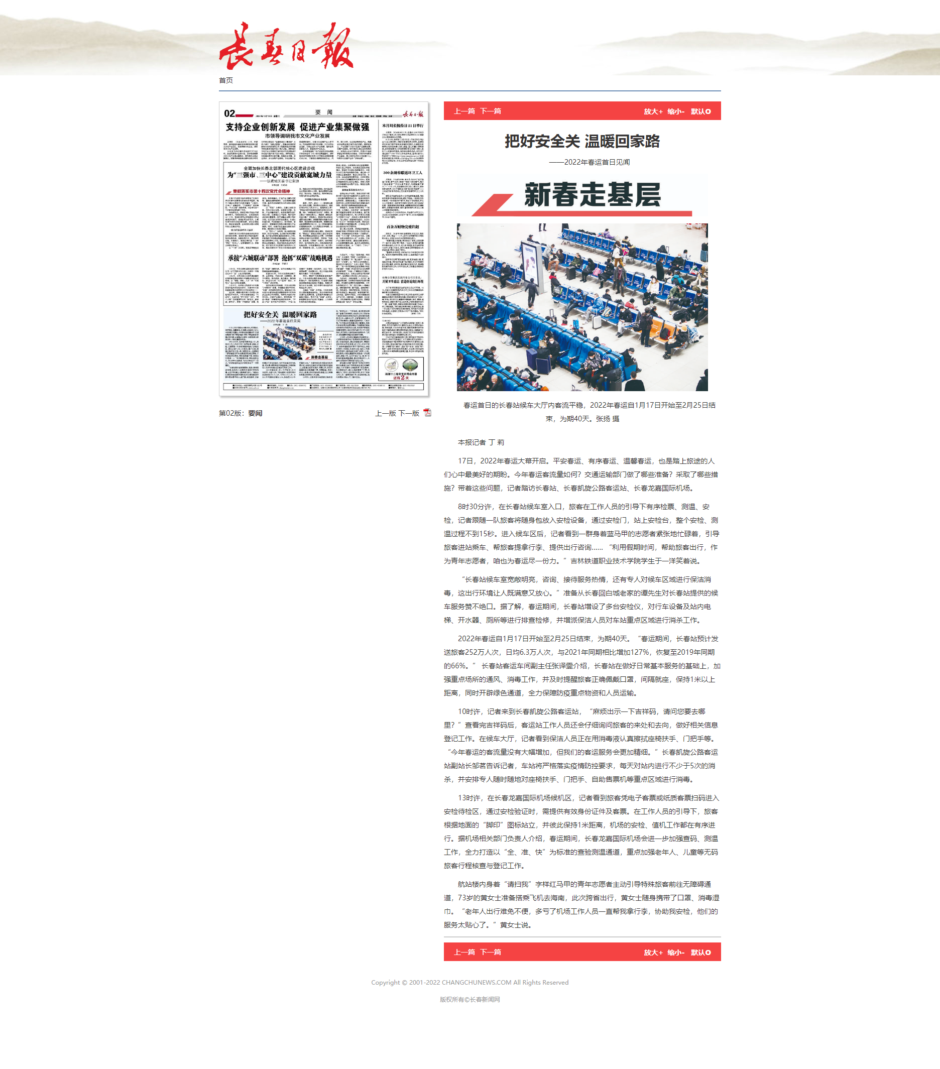 1月18日,长春日报在第二版要闻以《把好安全关 温暖回家路》为题,对我校于一洋等同学在长春火车站开展春运志愿服务的情况进行了宣传报道。