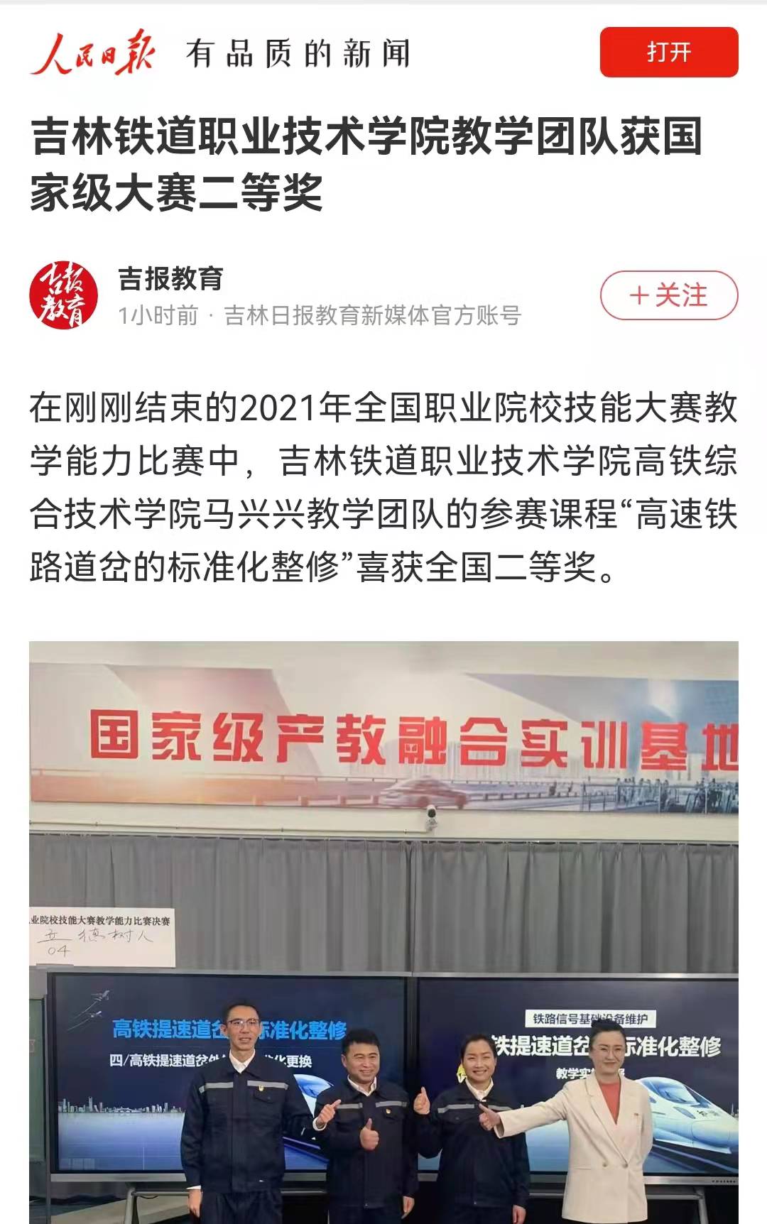 12月28日,【人民日报】“吉报教育”以“吉林铁道职业技术学院教学团队获国家级大赛二等奖”为题对我校进行了报道。