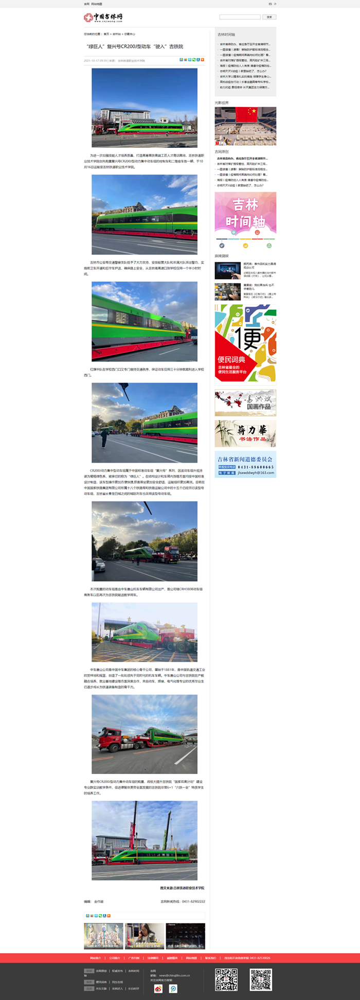 10月17日,中国吉林网以《“绿巨人”复兴号CR200J型动车“驶入”吉铁院》为题,对我校加强技能人才培养质量、打造高寒高铁高端工匠人才育训高地,创先购置复兴号CR200J型动力集中动车组的情况进行了报道。