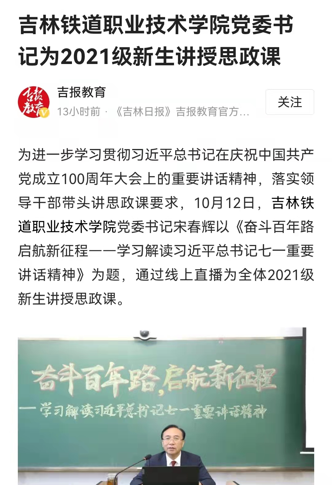10月15日,【今日头条】“吉报教育”以“吉林铁道职业技术学院党委书记为2021级新生讲授思政课”为题对我校进行了报道。