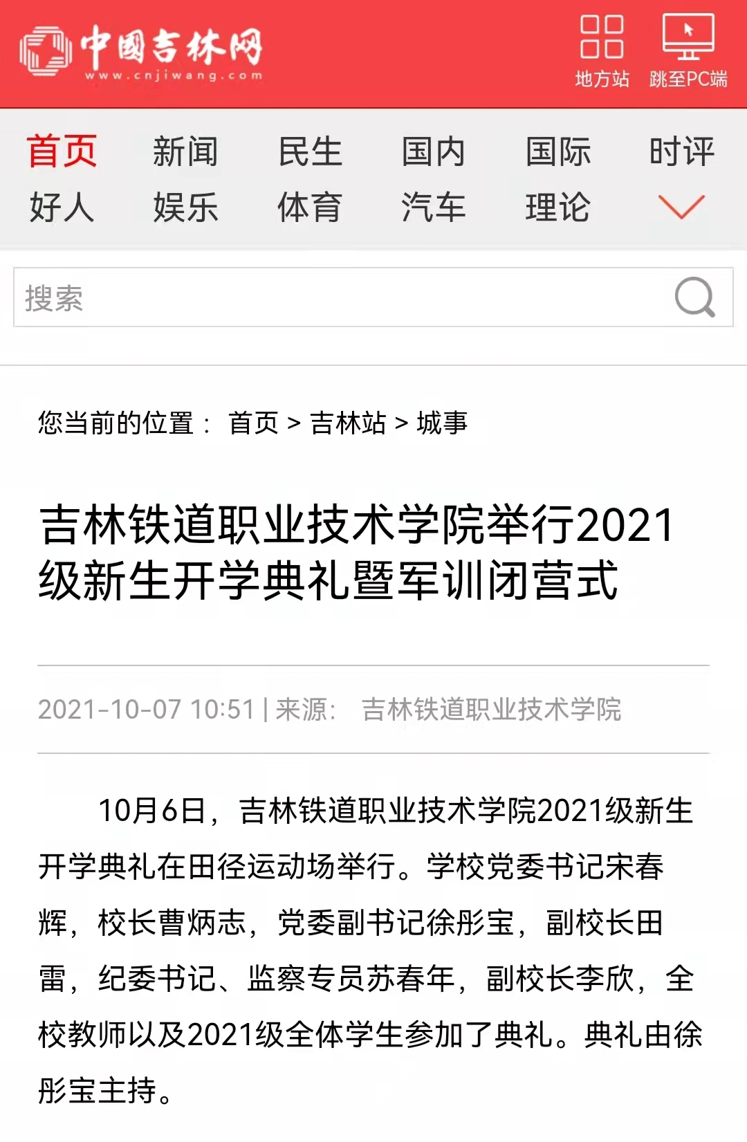 10月7日,【中国吉林网】以“吉林铁道职业技术学院举行2021级新生开学典礼暨军训闭营式”为题对我校进行了报道。