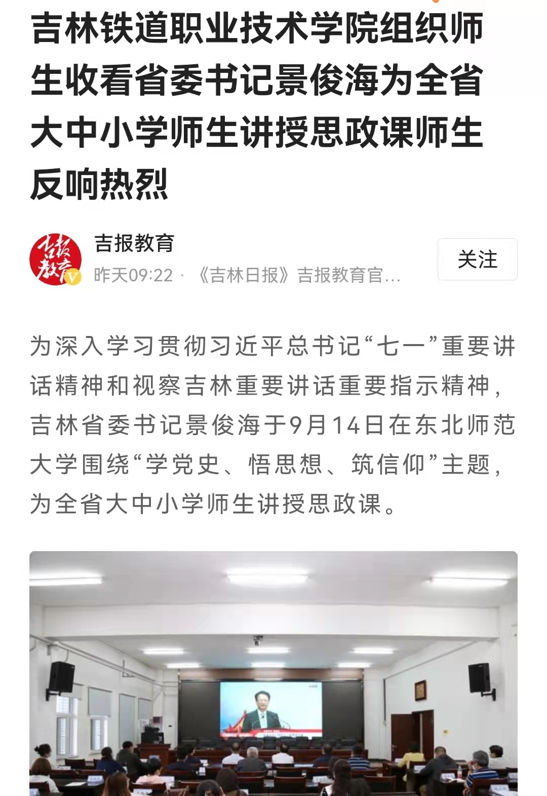 9月15日,【今日头条】“吉报教育”以“吉林铁道职业技术学院组织师生收看省委书记景俊海为全省大中小学师生讲授思政课师生反响热烈”为题对我校进行了报道。
