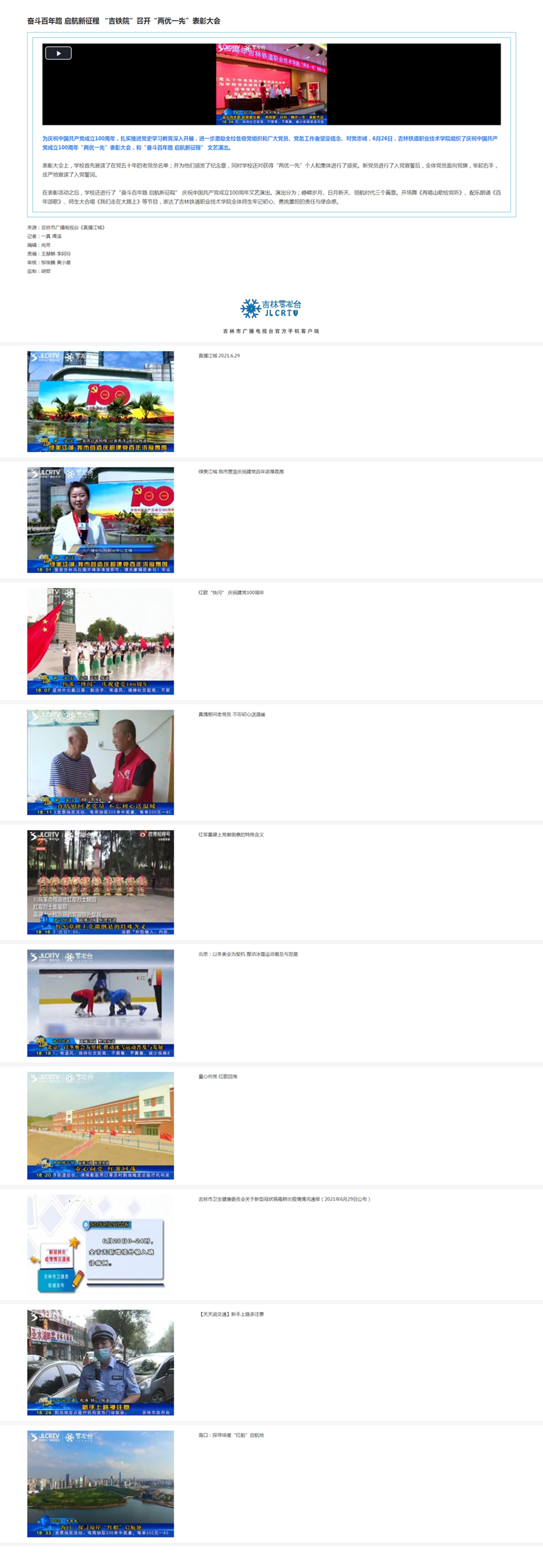 6月29日,【吉林市广播电视台】以“奋斗百年路 启航新征程 ‘吉铁院’召开‘两优一先’表彰大会”为题对我校庆祝中国共产党成立100周年“两优一先”表彰大会,和“奋斗百年路 启航新征程” 文艺演出进行了报道。