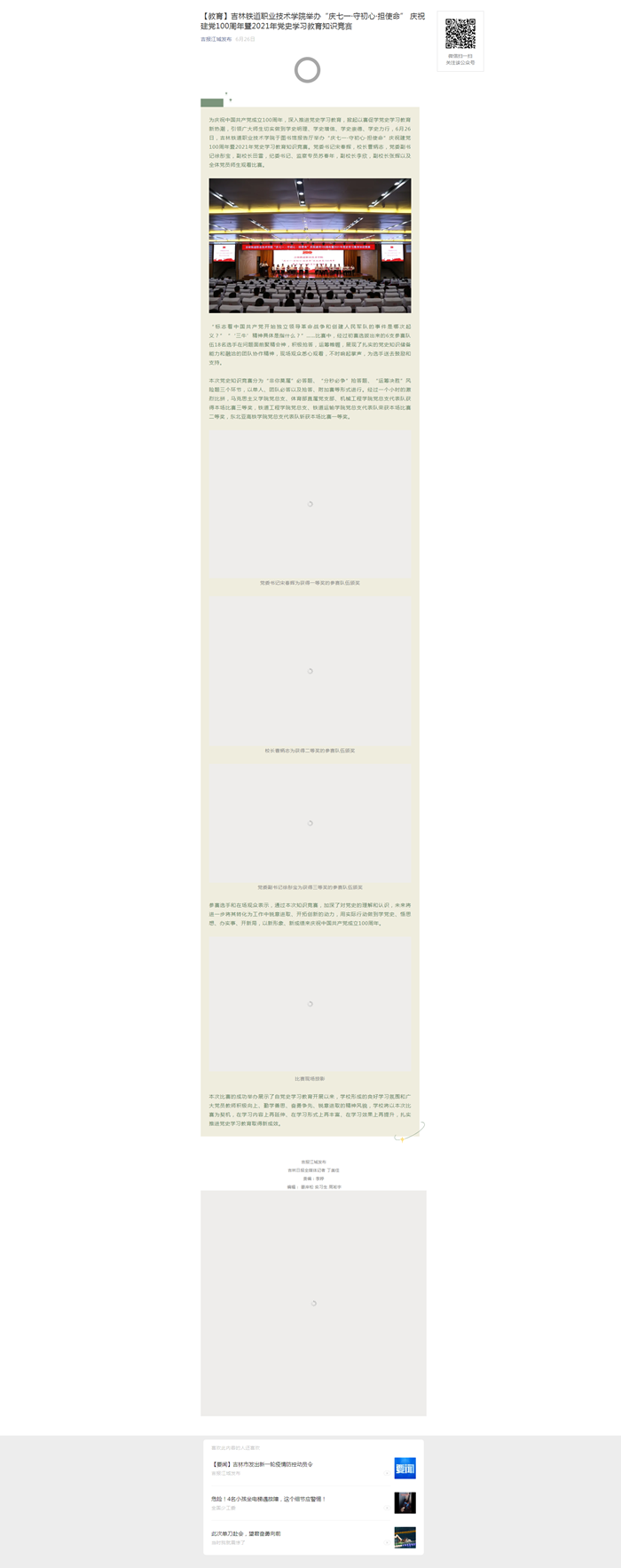 6月26日,【吉报江城发布】以“吉林铁道职业技术学院举办‘庆七一·守初心·担使命’ 庆祝建党100周年暨2021年党史学习教育知识竞赛”为题对我校庆祝建党100周年暨2021年党史学习教育知识竞赛进行了报道。