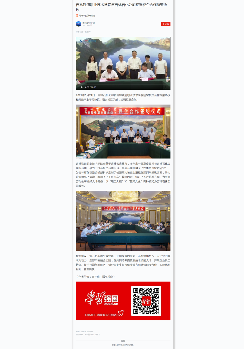 6月27日,【学习强国】吉林学习平台以“吉林铁道职业技术学院与吉林石化公司签署校企合作框架协议”为题对我校与吉林石化公司开展校企合作进行了报道。