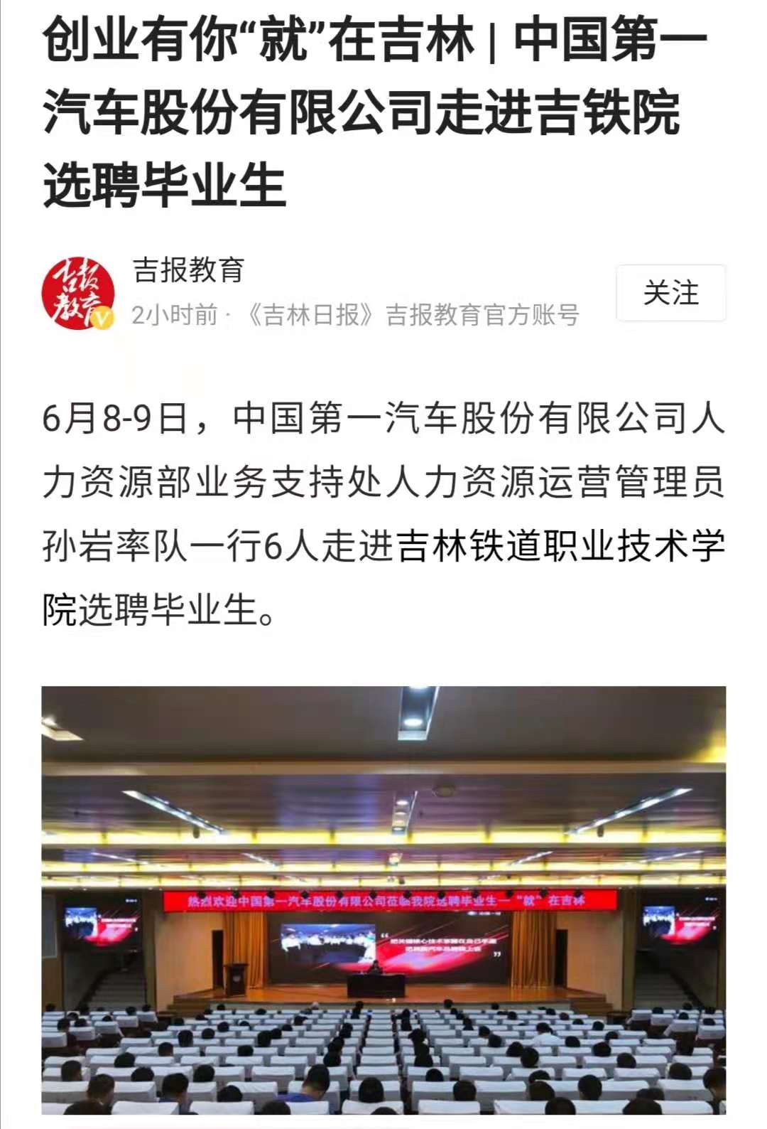 6月15日,【今日头条】“吉报教育”以“创业有你“就”在吉林 | 中国第一汽车股份有限公司走进吉铁院选聘毕业生”为题对我校进行了报道。