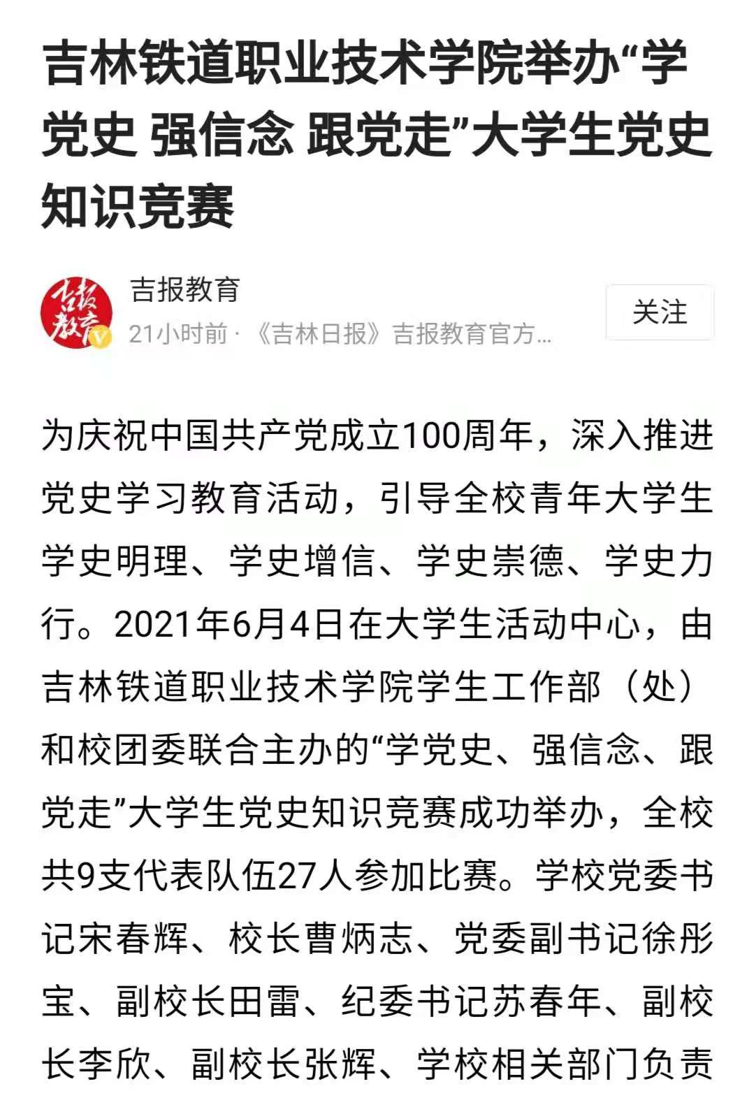 6月8日,【今日头条】“吉报教育”以“吉林铁道职业技术学院举办“学党史 强信念 跟党走”大学生党史知识竞赛”为题对我校进行了报道。