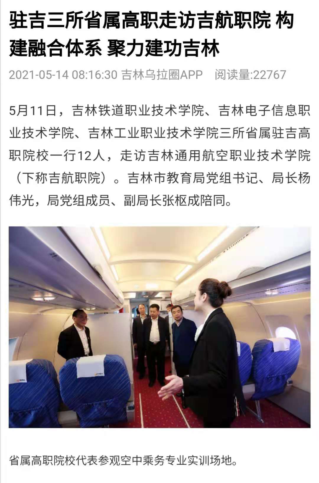 5月14日,【吉林乌拉圈】以“驻吉三所省属高职走访吉航职院 构建融合体系 聚力建功吉林”为题对我校进行了报道。