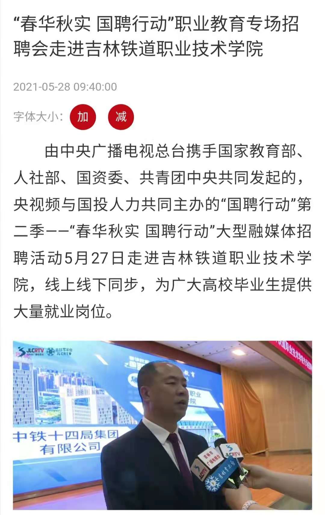 5月28日,【吉视通】以“春华秋实 国聘行动”职业教育专场招聘会走进吉林铁道职业技术学院”为题对我校进行了报道。