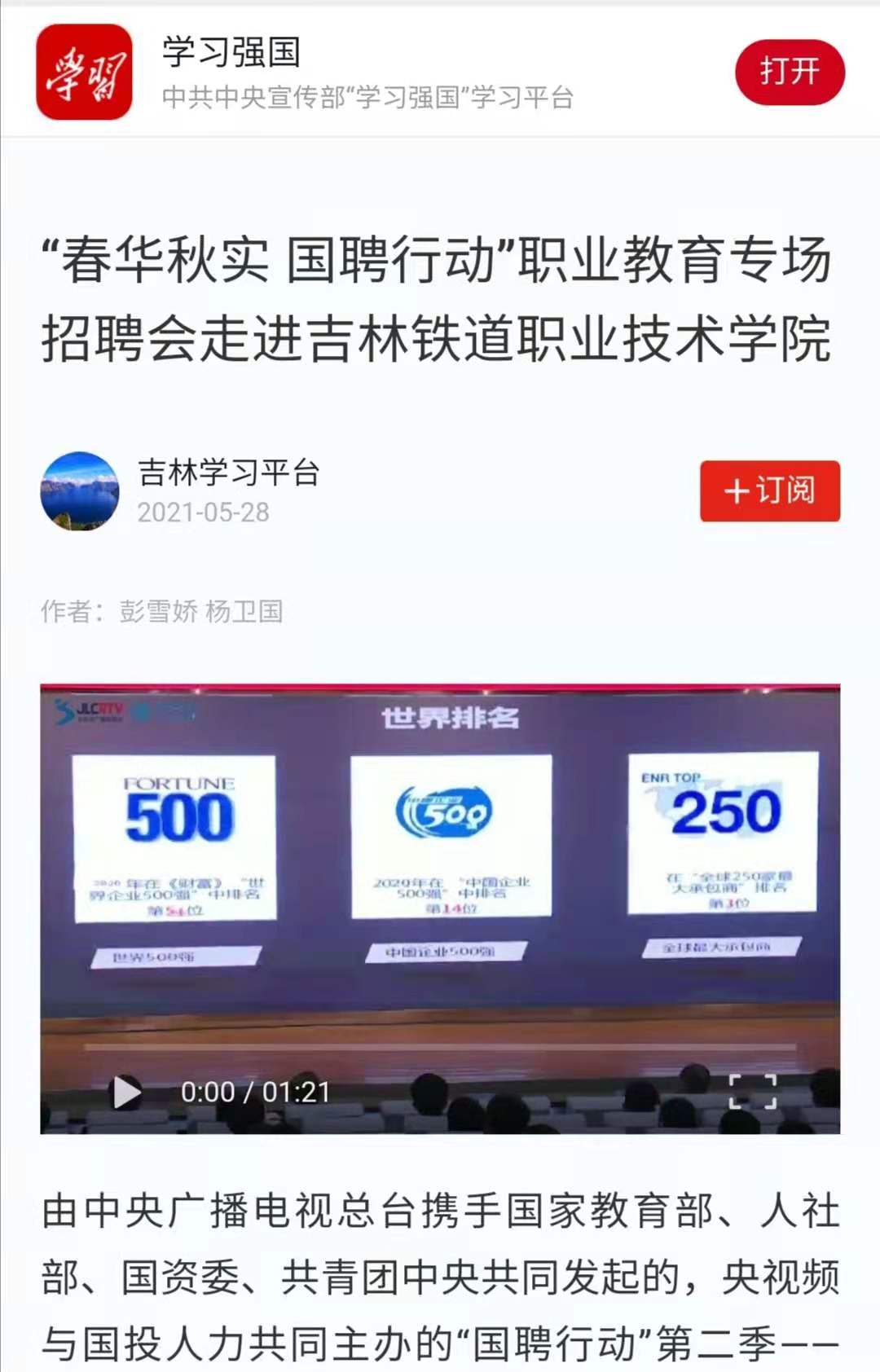 5月28日,【学习强国】以“春华秋实 国聘行动”职业教育专场招聘会走进吉林铁道职业技术学院”为题对我校进行了报道。
