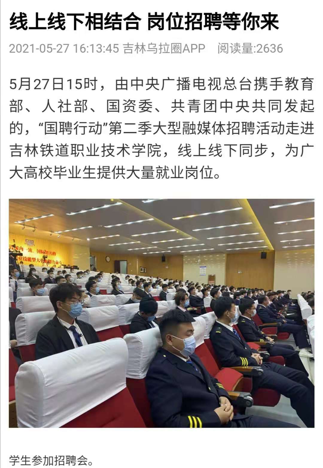 5月27日,【吉林乌拉圈】以“线上线下相结合 岗位招聘等你来”为题对我校进行了报道。