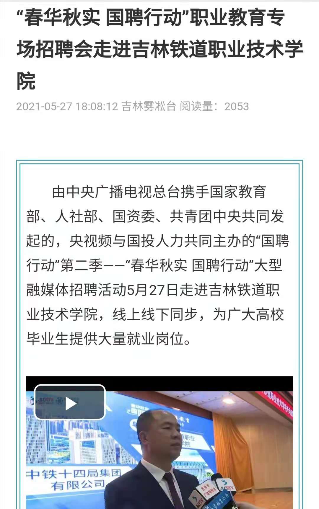 5月27日,【吉林雾凇台】以“春华秋实 国聘行动”职业教育专场招聘会走进吉林铁道职业技术学院”为题对我校进行了报道。