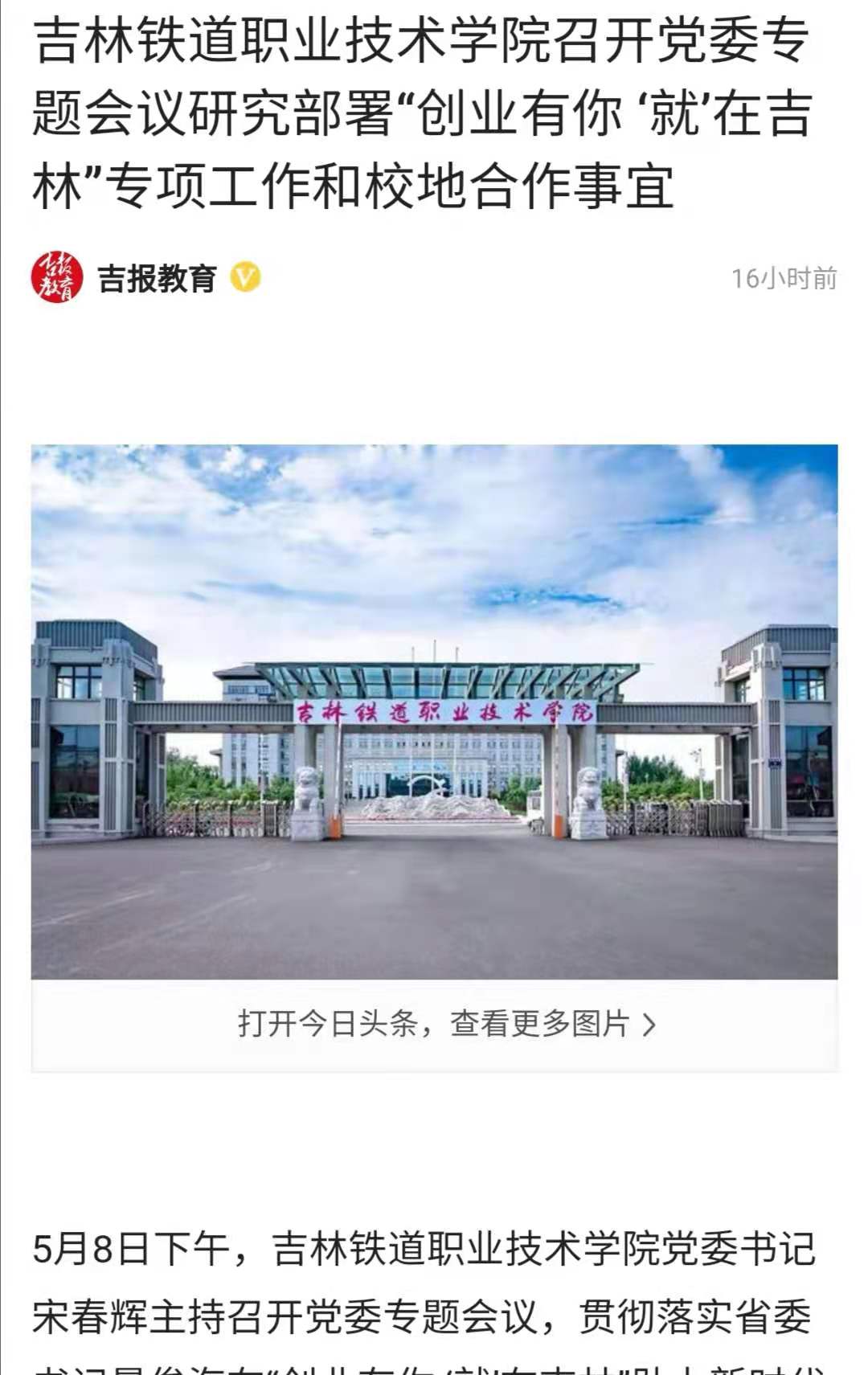 5月8日,【今日头条】“吉报教育”以“吉林铁道职业技术学院召开党委专题会议研究部署“创业有你‘就’在吉林”专项工作和校地合作事宜”为题对我校进行了报道。