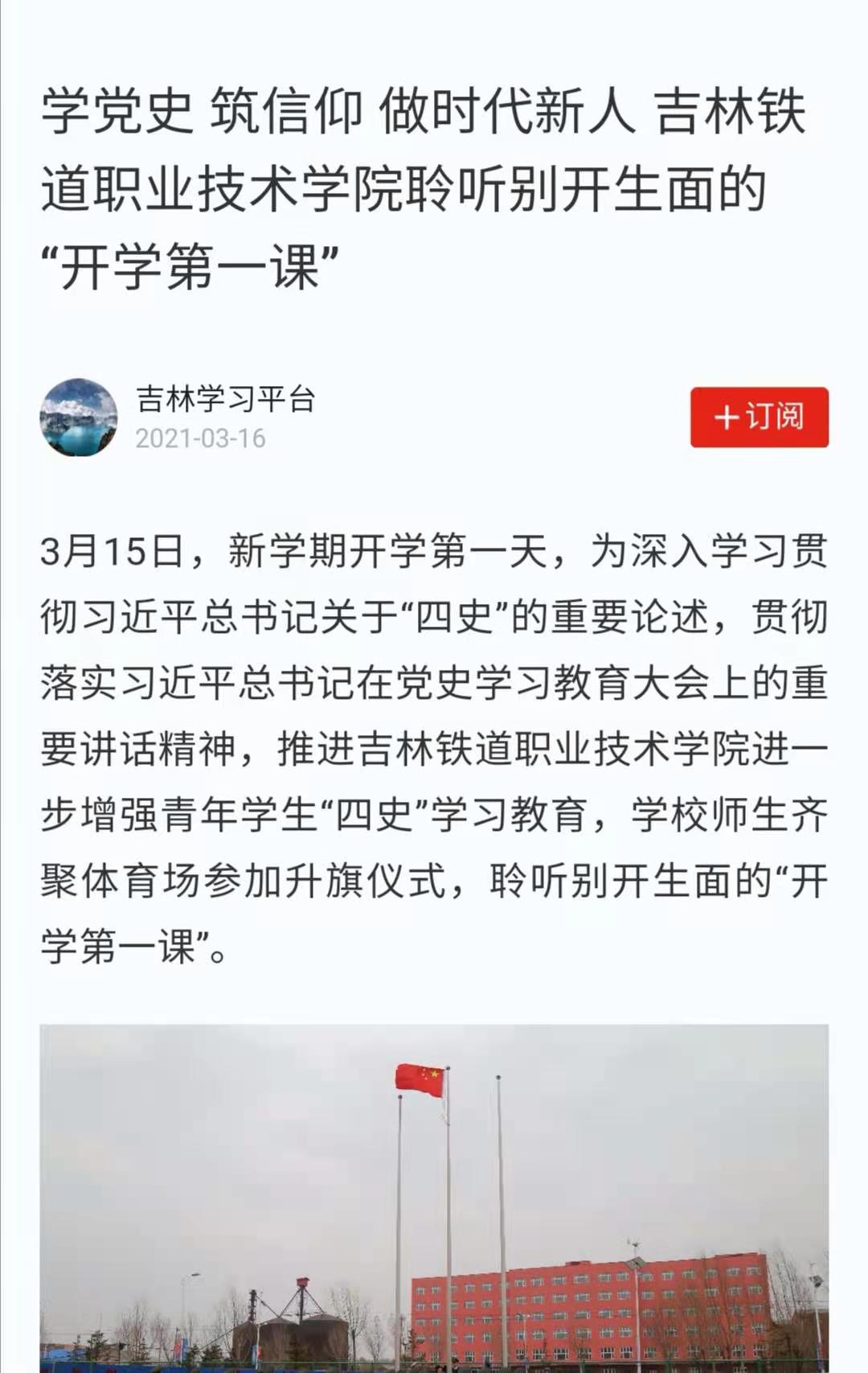 3月16日,【学习强国】以《学党史 筑信仰 做时代新人 吉林铁道职业技术学院聆听别开生面的“开学第一课”》为题对我校举行“学党史•筑信仰•做时代新人•开学第一课”暨2021年春季新学期开学升国旗仪式进行了报道。
