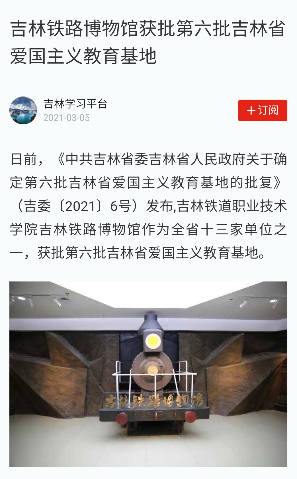 3月4日,【学习强国】对我校吉林铁路博物馆获批第六批吉林省爱国主义教育基地进行了报道。