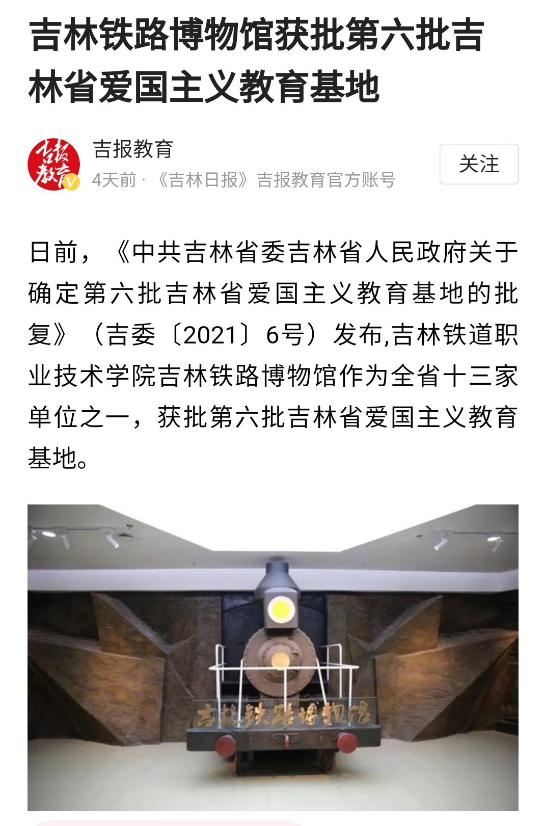 3月4日,【吉报教育】对我校吉林铁路博物馆获批第六批吉林省爱国主义教育基地进行了报道。