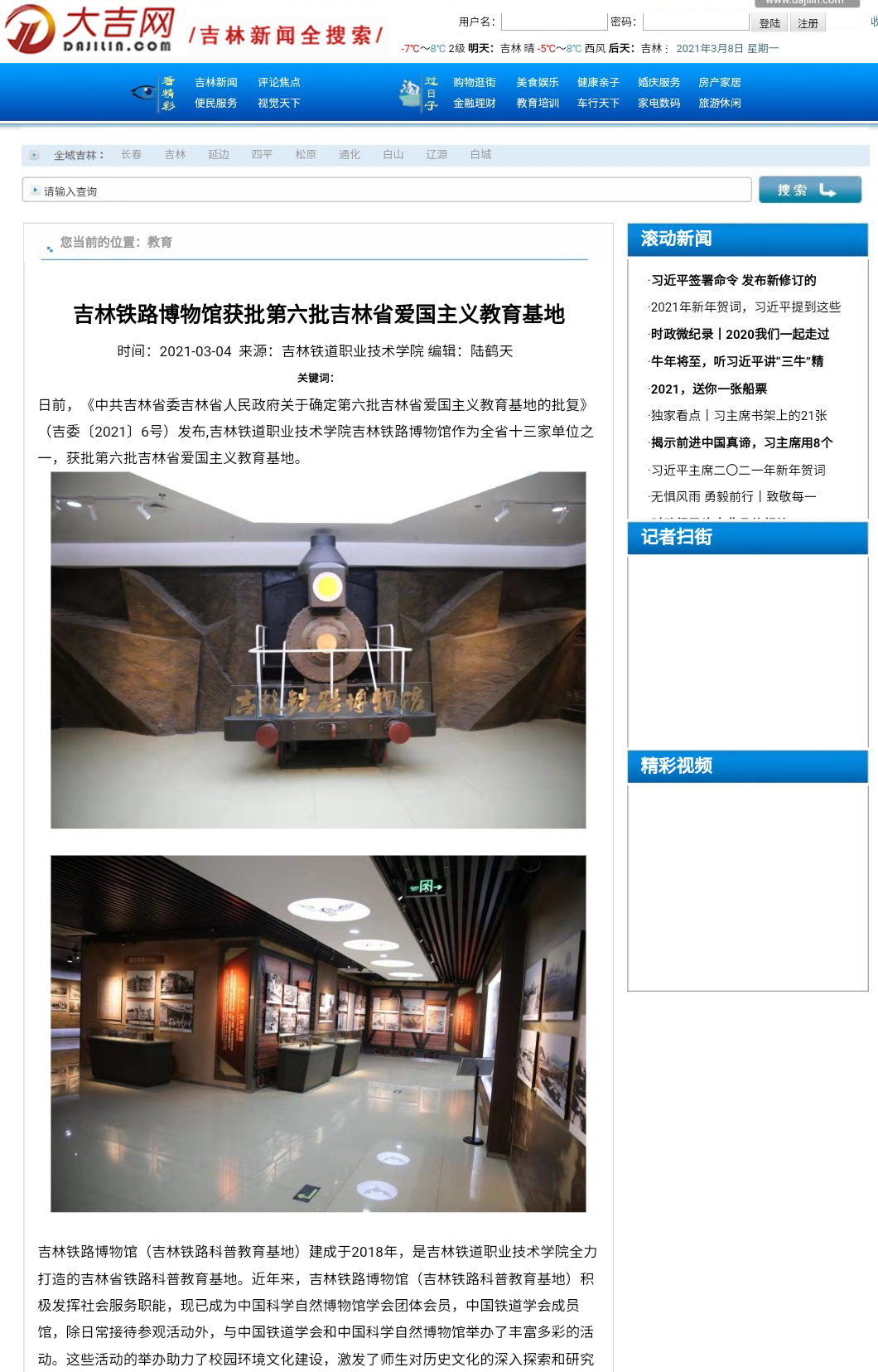 3月4日,【大吉网】对我校吉林铁路博物馆获批第六批吉林省爱国主义教育基地进行了报道。