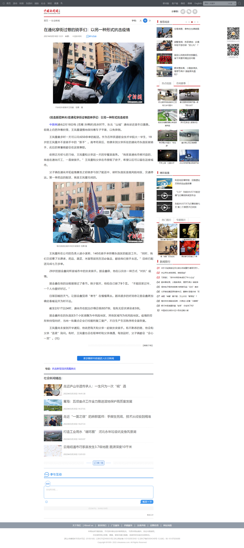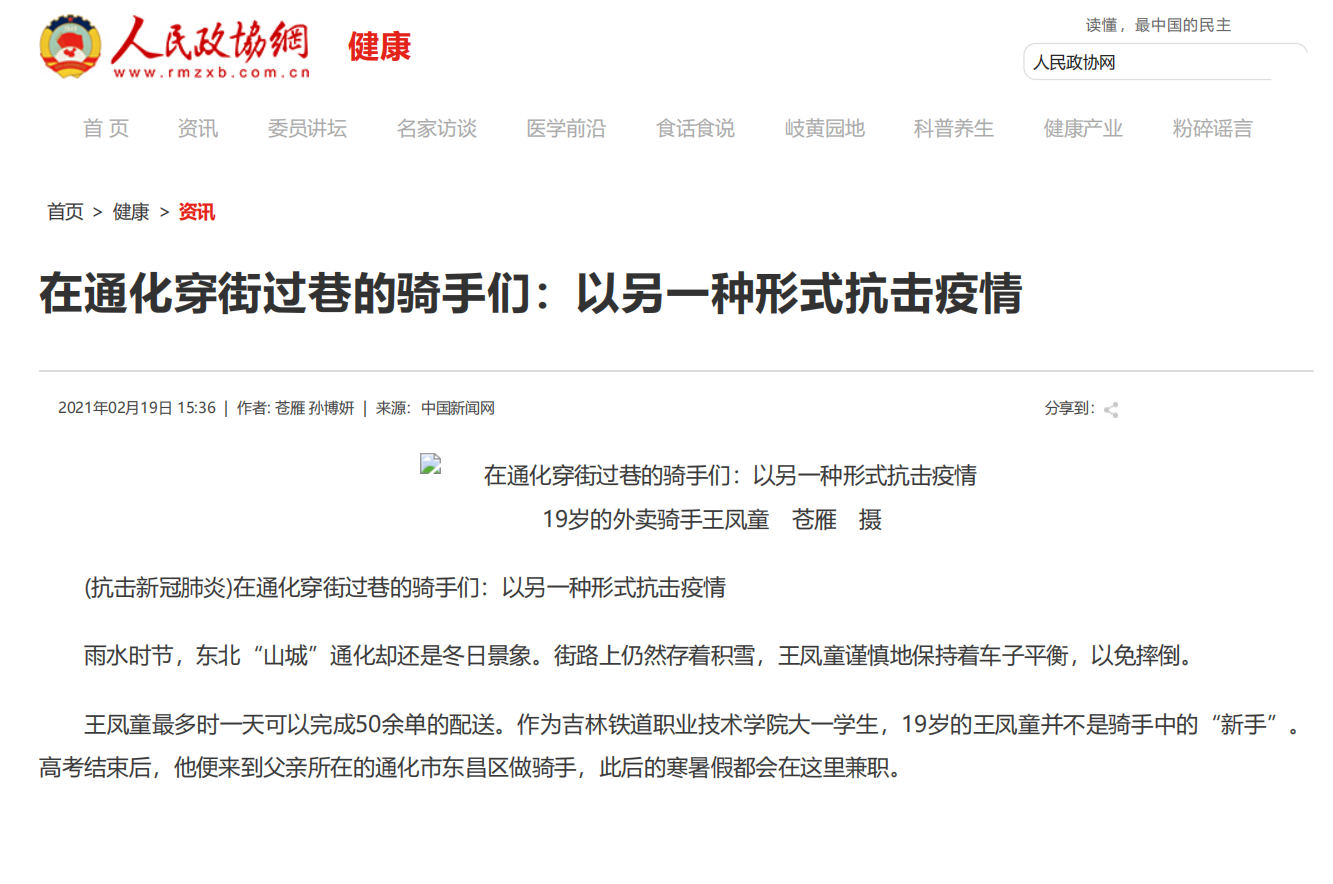 2月18、19日,中国新闻网、人民政协网以《在通化穿街过巷的骑手们:以另一种形式抗击疫情》为题,对我校学生王凤童利用寒暑假开展社会实践,助力疫情防控情况进行了宣传报道。