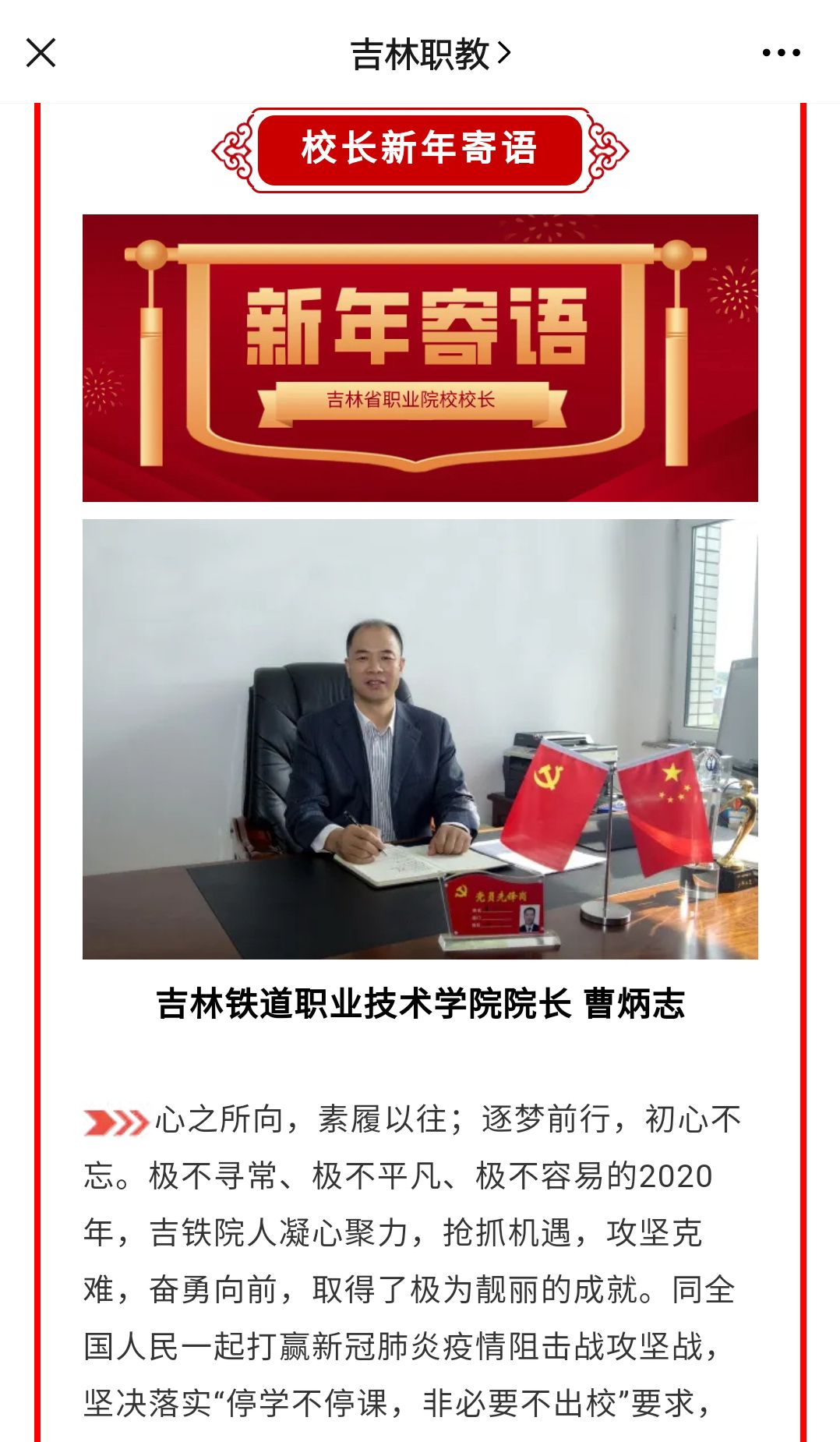 1月3日,【吉林教育电视台】《职有魅力》栏目新媒体布发平台“吉林职教”以“【校长寄语】吉林铁道职业技术学院:打造高寒高铁高端工匠人才育训高地!”为题对我校校长曹炳志的新年寄语进行了报道。