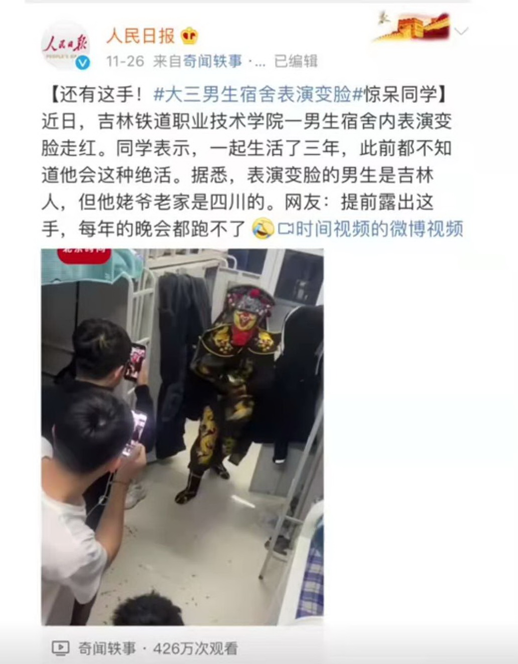 11月26日,《人民日报》《新华网》《中国青年报》等数十家媒体对我校东北亚高铁学院李宇航同学在寝室表演变脸进行了报道。