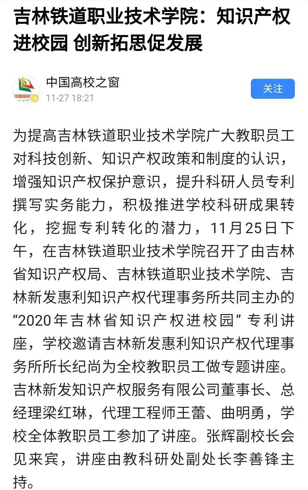11月27日,《中国高校之窗》以“吉林铁道职业技术学院:知识产权进校园 创新拓思促发展”为题,对我校知识产权专题讲座进行了报道。