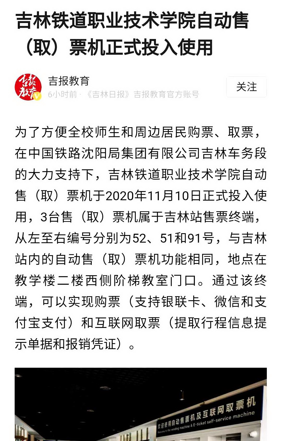 11月12日,《吉报教育》以“吉林铁道职业技术学院自动售(取)票机正式投入使用”为题,对我校服务社会的举措进行了报道。