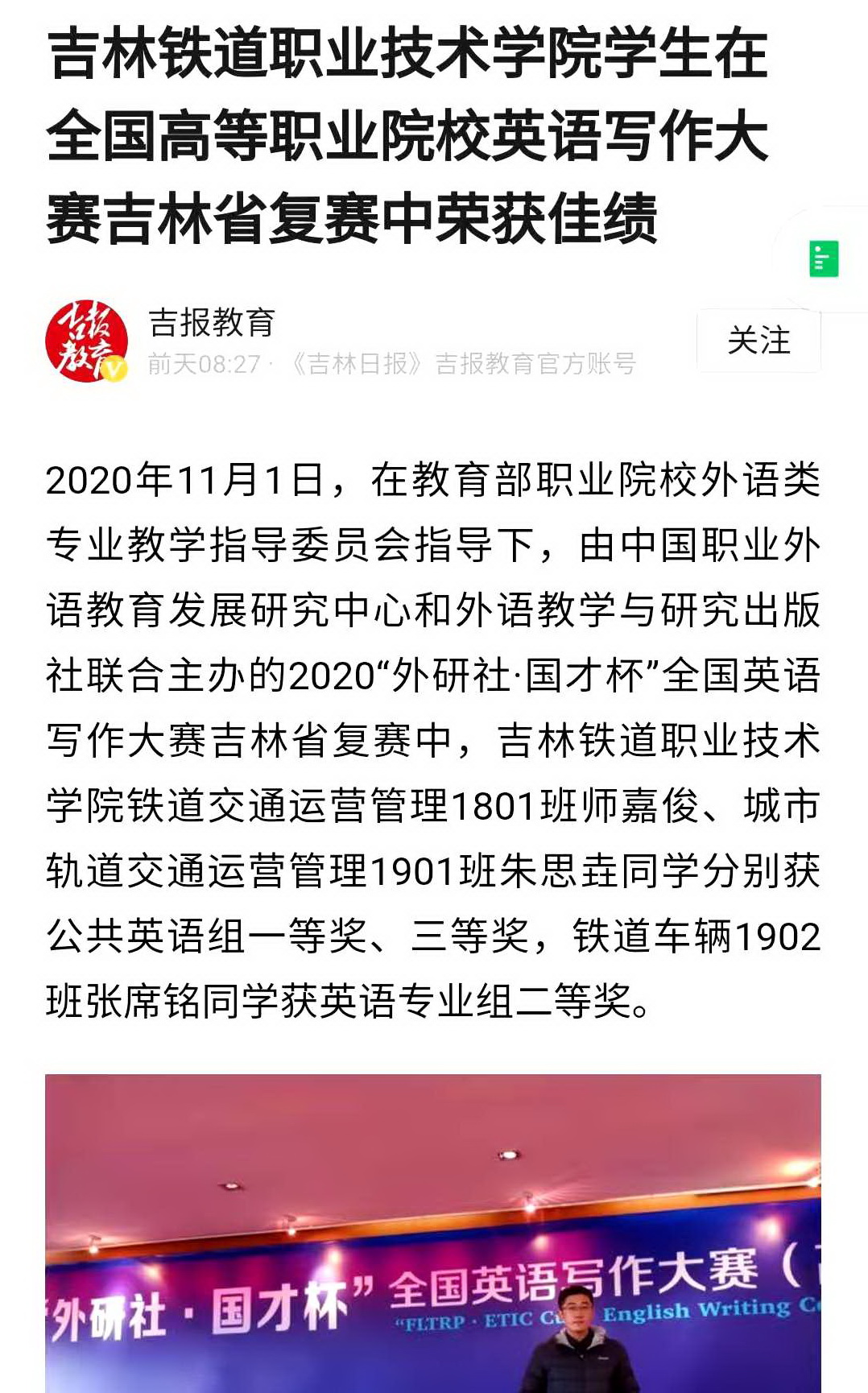 11月10日,《吉报教育》以“吉林铁道职业技术学院学生在全国高等职业院校英语写作大赛吉林省复赛中荣获佳绩”为题,对我校在全国高等职业院校英语写作大赛吉林省复赛中的优异表现进行了报道。