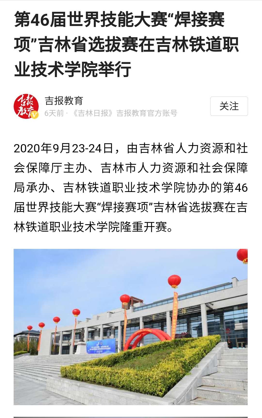 9月30日,《吉报教育》以“第46届世界技能大赛“焊接赛项”吉林省选拔赛在吉林铁道职业技术学院举行”为题,对我校协办的第46届世界技能大赛“焊接赛项”吉林省选拔赛进行了报道。