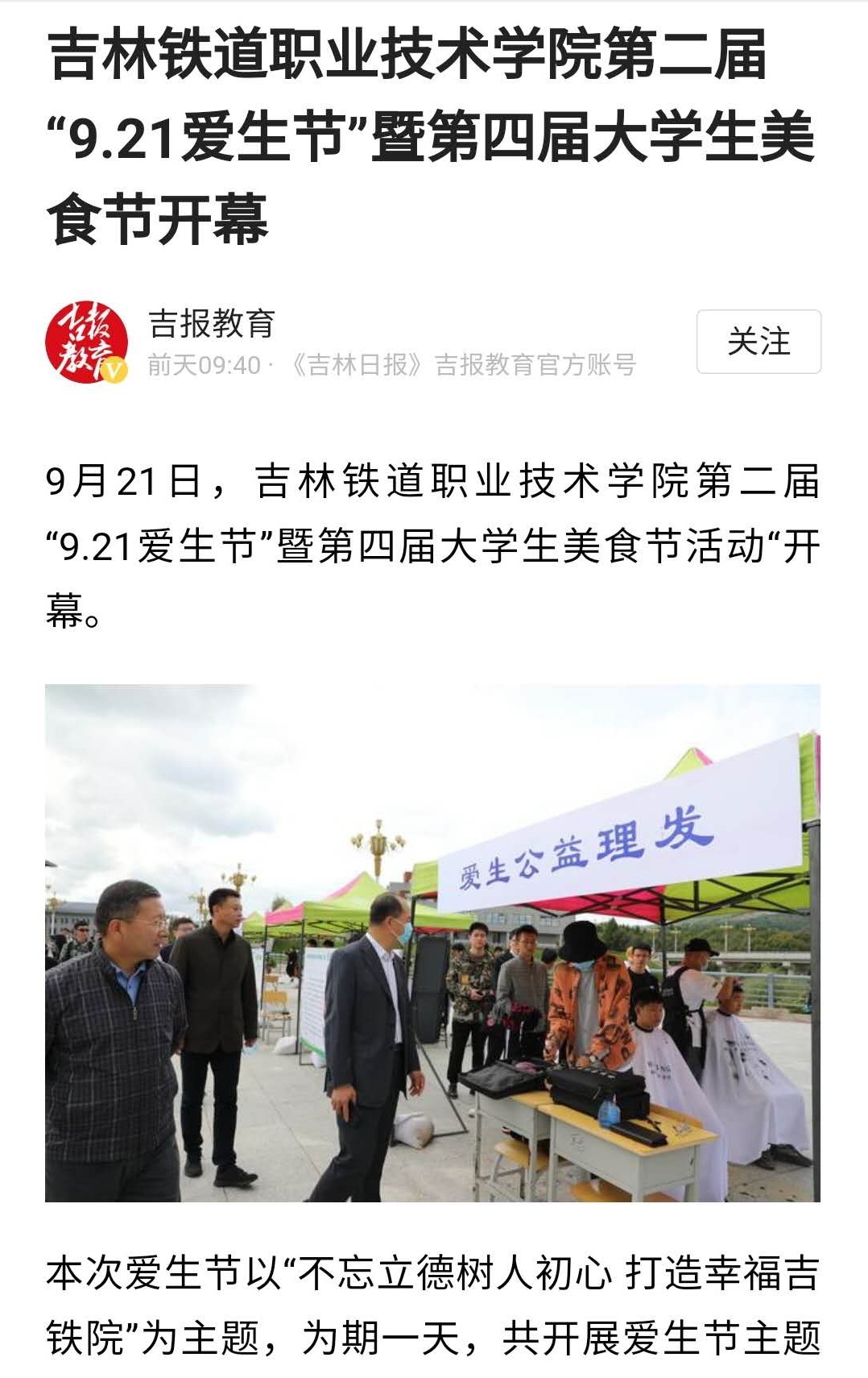 9月22日,《吉报教育》以“吉林铁道职业技术学院第二届“9.21爱生节”暨第四届大学生美食节开幕”为题,对我校第二届“9.21爱生节”暨第四届大学生美食节进行了报道。
