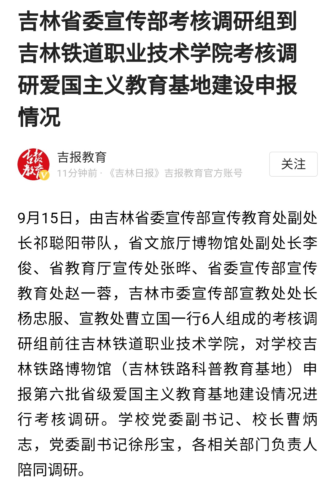 9月19日,《吉报教育》以“吉林省委宣传部考核调研组到吉林铁道职业技术学院考核调研爱国主义教育基地建设申报情况”为题,对吉林省委宣传部考核调研组到我校调研爱国主义教育基地建设申报情况进行了报道。