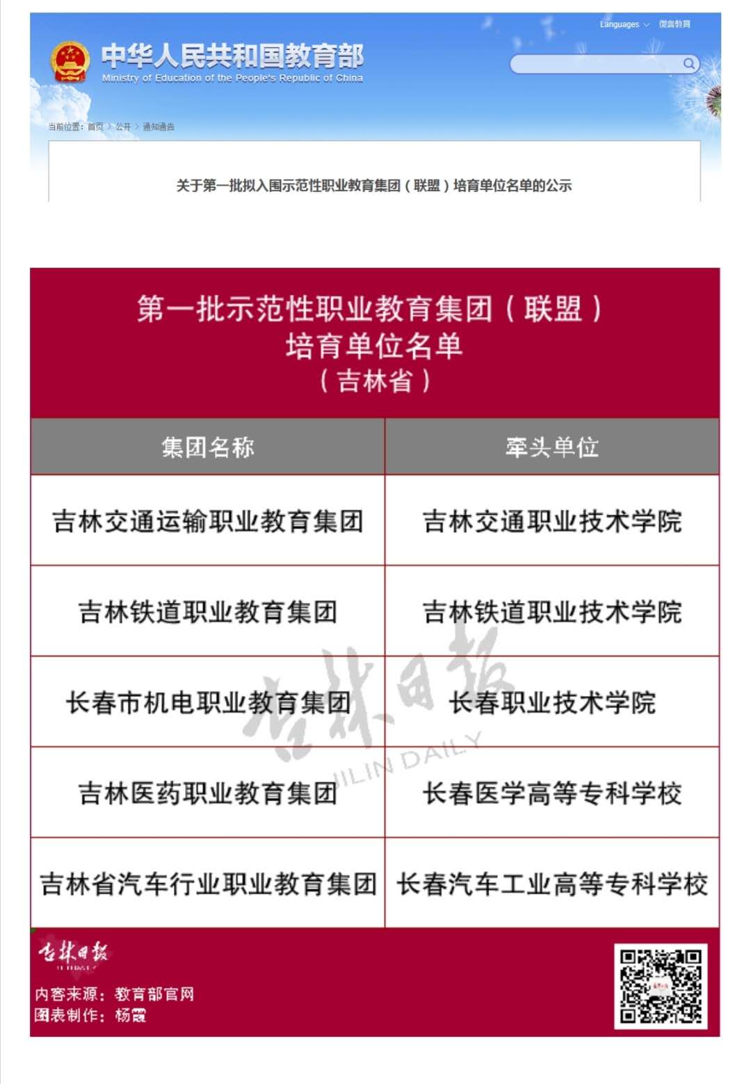 9月9日,《吉林日报》以“首批全国示范!吉林省5高校在列,教育部最新公示来了!”为题,对我校吉林铁道职业教育集团拟入围示范性职业教育集团(联盟)培育单位名单进行报道。