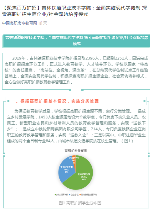 8月3日,《中国高职高专教育网》以“吉林铁道职业技术学院:全面实施现代学徒制 探索高职扩招生源企业/社会双轨培养模式”为题,对我校高职扩招工作进行了报道。