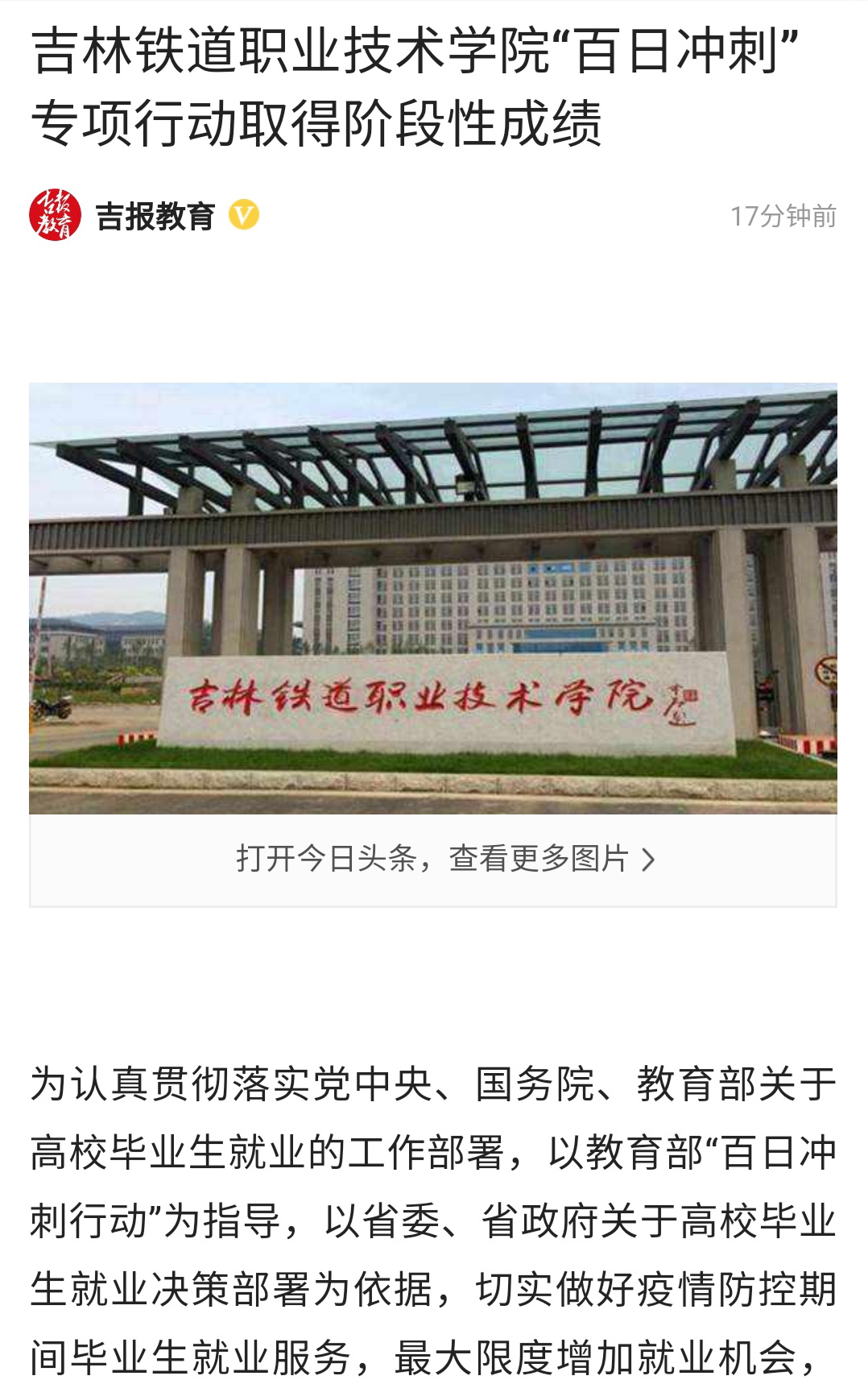 7月24日,《吉报教育》以“吉林铁道职业技术学院“百日冲刺”专项行动取得阶段性成绩”为题,对我校就业工作进行了报道。