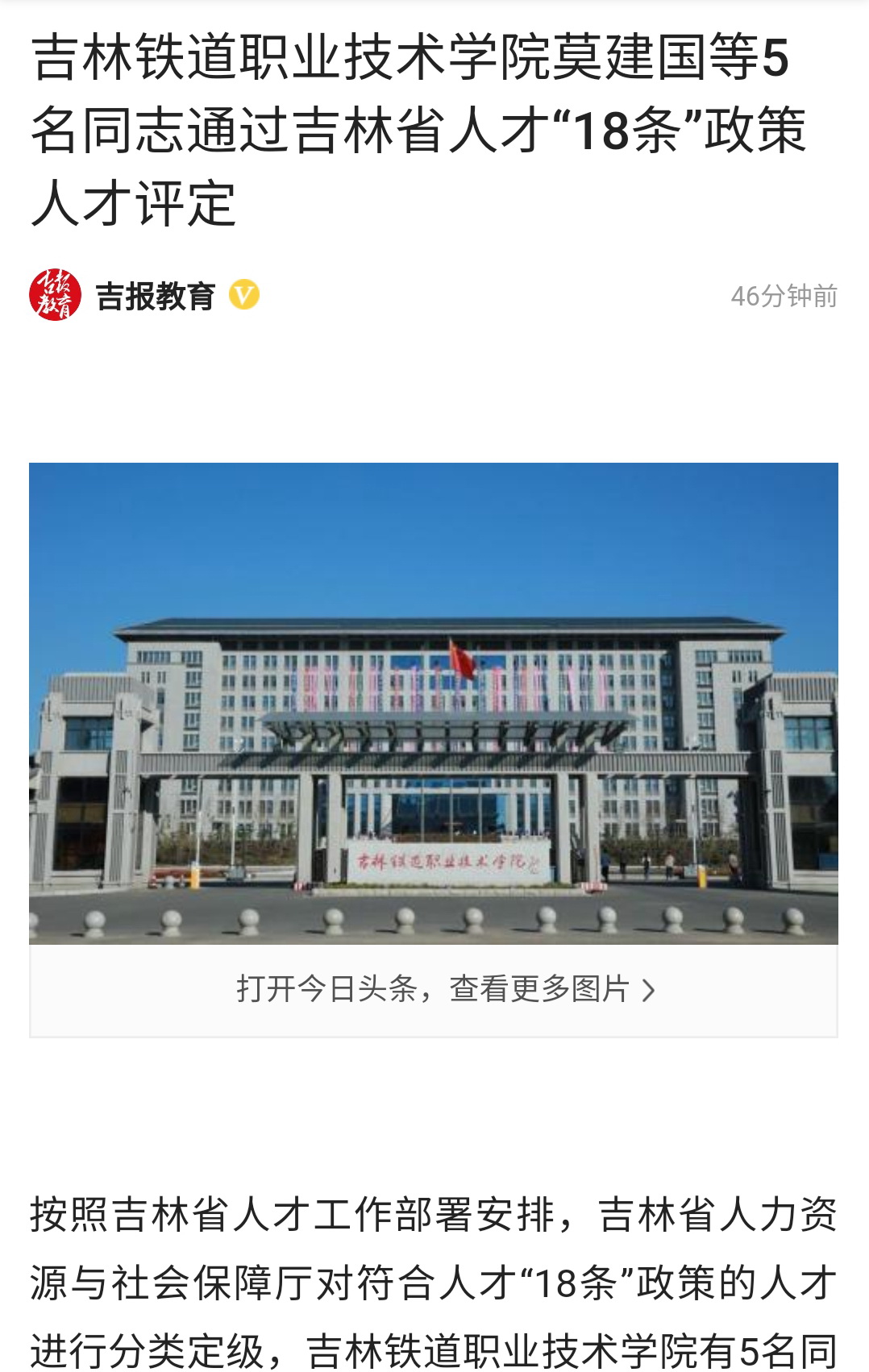 7月24日,《吉报教育》以“吉林铁道职业技术学院莫建国等5名同志通过吉林省人才“18条”政策人才评定”为题,对我校莫建国、李东君、曹炳志、张辉、徐光华等5名同志通过吉林省人才“18条”政策人才评定进行了报道