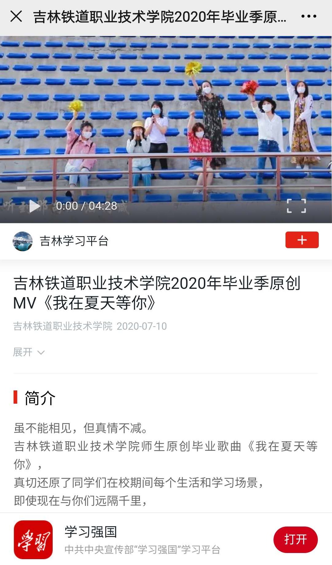 7月10日,《学习强国》转发我校2020年毕业季原创MV《我在夏天等你》。