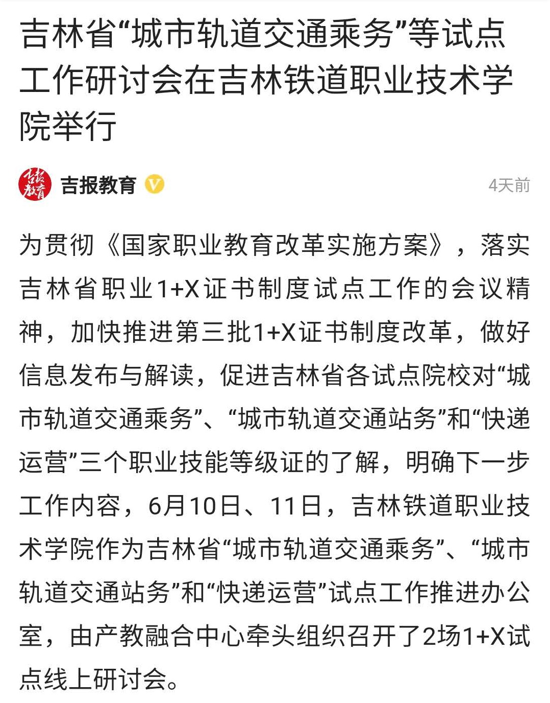 7月6日,《吉报教育》以“吉林省“城市轨道交通乘务”等试点工作研讨会在吉林铁道职业技术学院举行”为题,对吉林省“城市轨道交通乘务”等试点工作研讨会进行了报道。