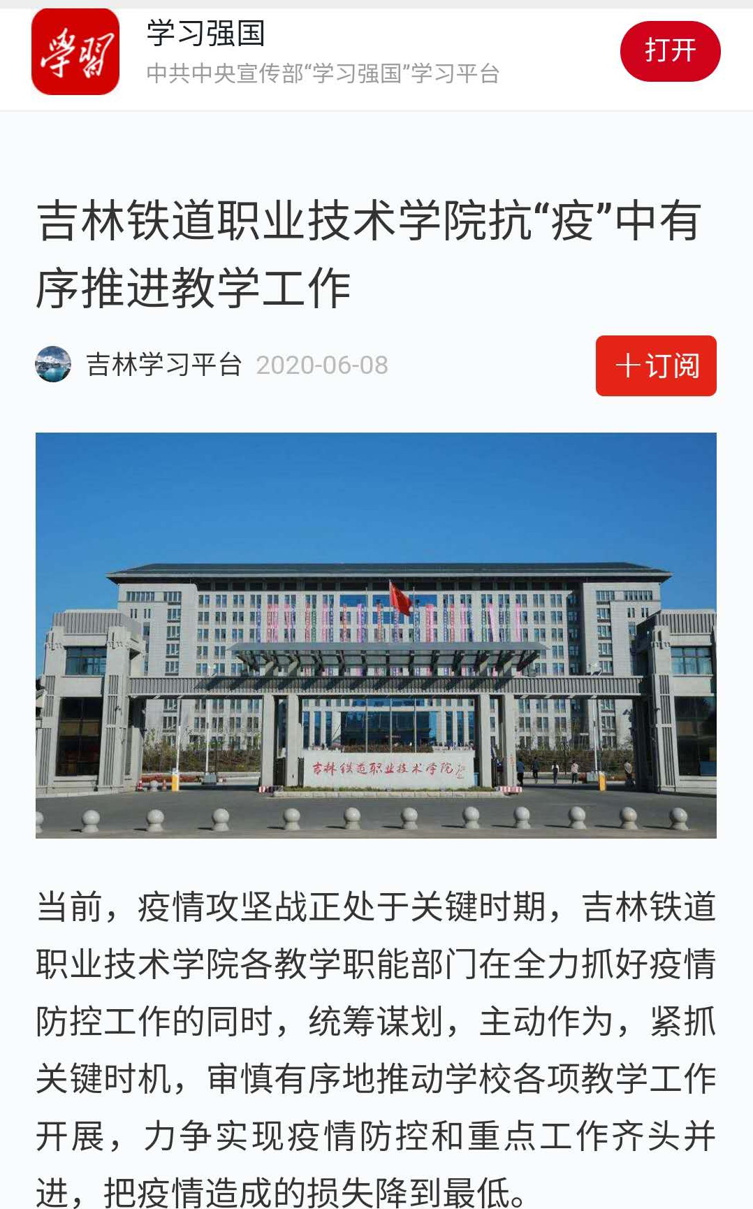 6月8日,《学习强国》学习平台以“吉林铁道职业技术学院抗‘疫’中有序推进教学工作”为题,对我校在疫情防控期间的教学工作进行了报道。