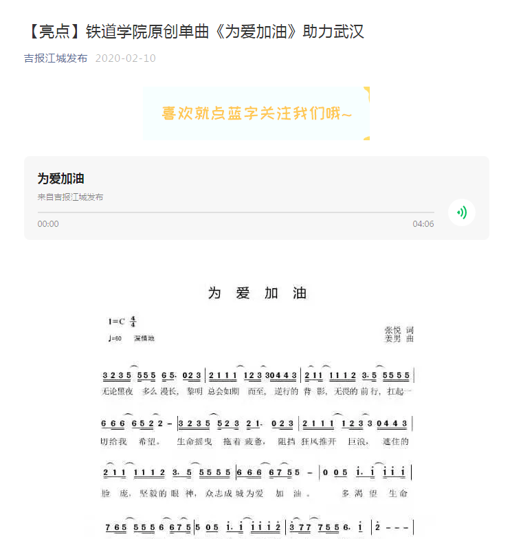 近日,《中国青年报》客户端和《吉报江城发布》等多家媒体以“吉林铁道职业技术学院师生创作歌曲《为爱加油》”为题,对学校团委组织师生创作歌曲为武汉加油进行了报道。