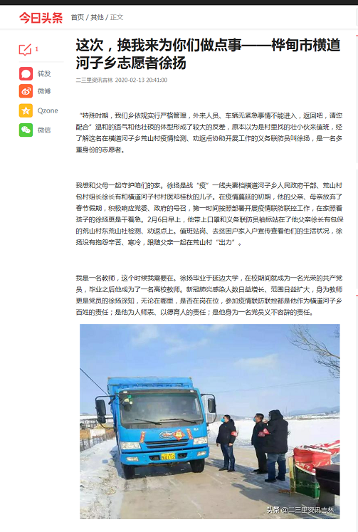 2月13日,《新文化报》二三里新闻APP和《江城日报》吉林乌拉圈APP分别以“这次,换我来为你们做点事——桦甸市横道河子乡志愿者徐扬”和“桦甸志愿者徐扬身上的三个关键词”为题,报道我校体育教学部教师徐扬同志在家乡桦甸市,协助当地政府义务开展抗“疫”联防工作的感人事迹。